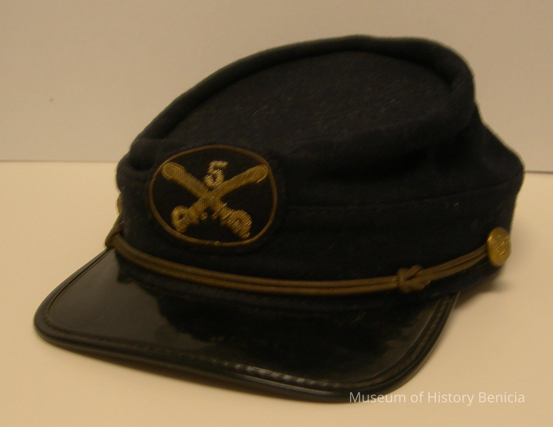 Hat - Reproduction Civil War Cavalry Kepi-type Hat; crossed sabers with "5" above (5th Cavalry); brass button on each side and thin round braid across front above the visor; dark blue wool, plastic/vinyl visor, leather band inside, size 7, union label "GS864377", "100% wool exclusive of ornamentation, manufacturer 3693"Collection
