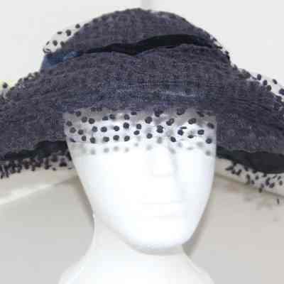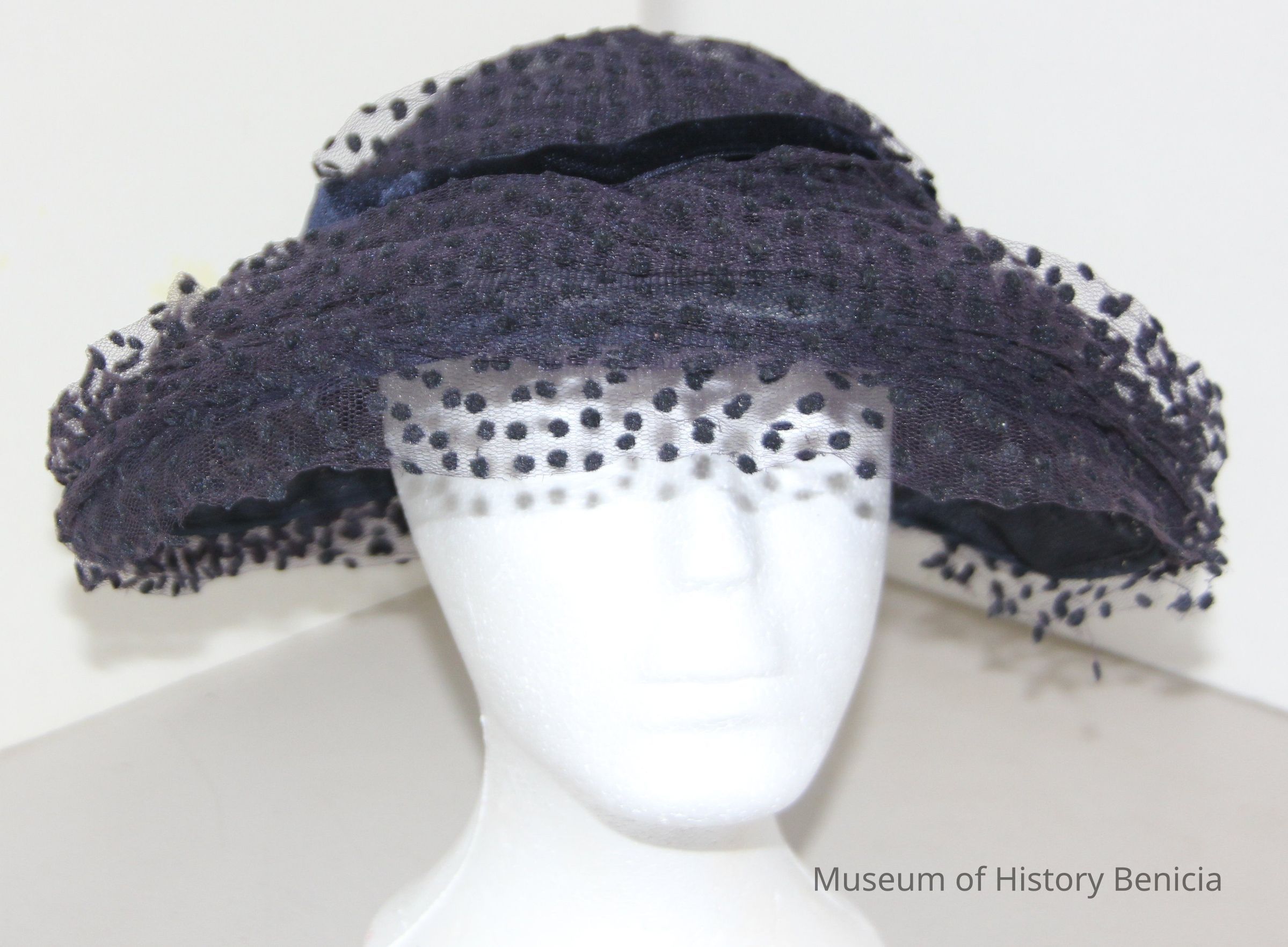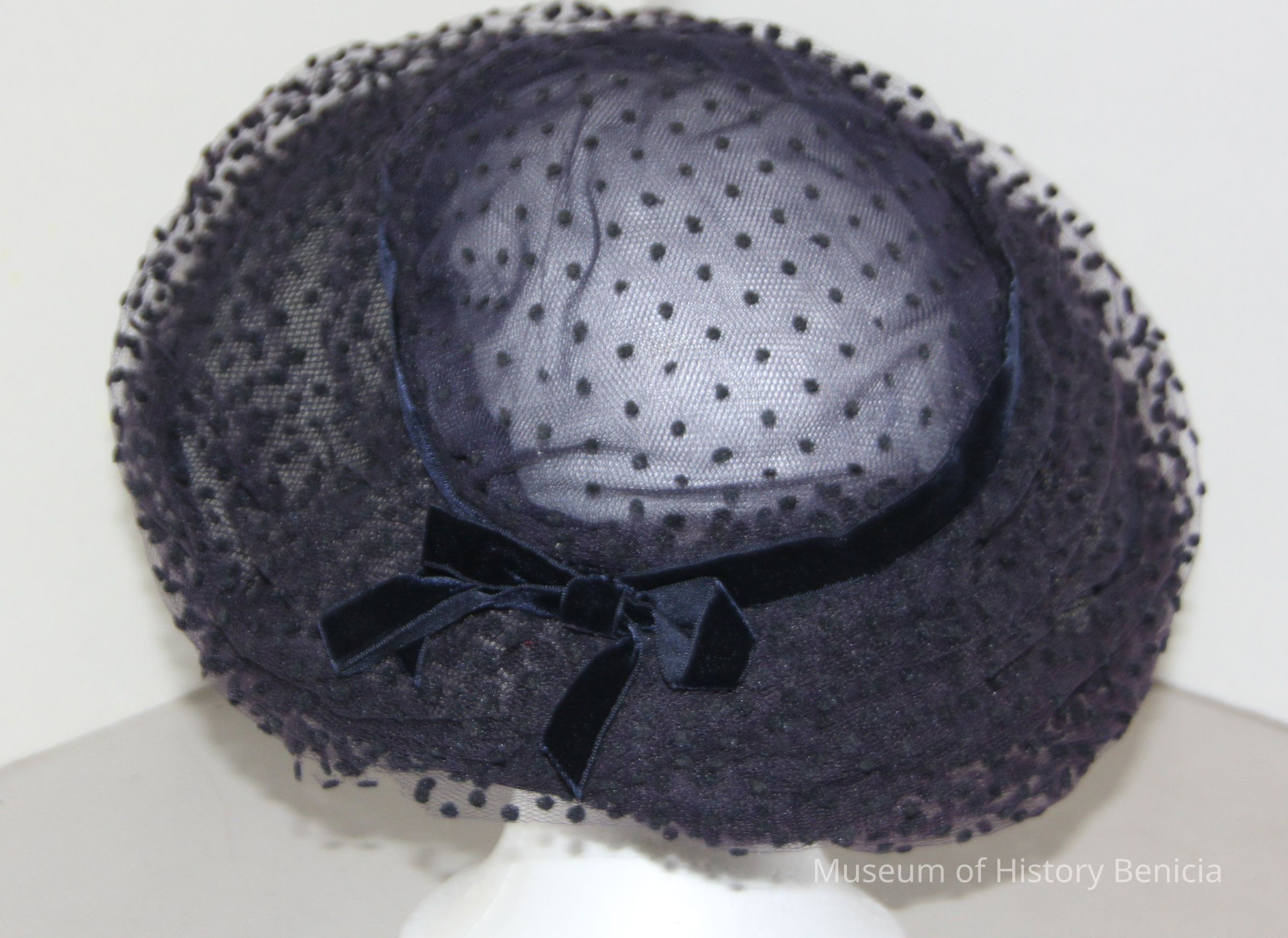 Black pillbox with wide brim - frame covered with dotted tulle, black velvet band.