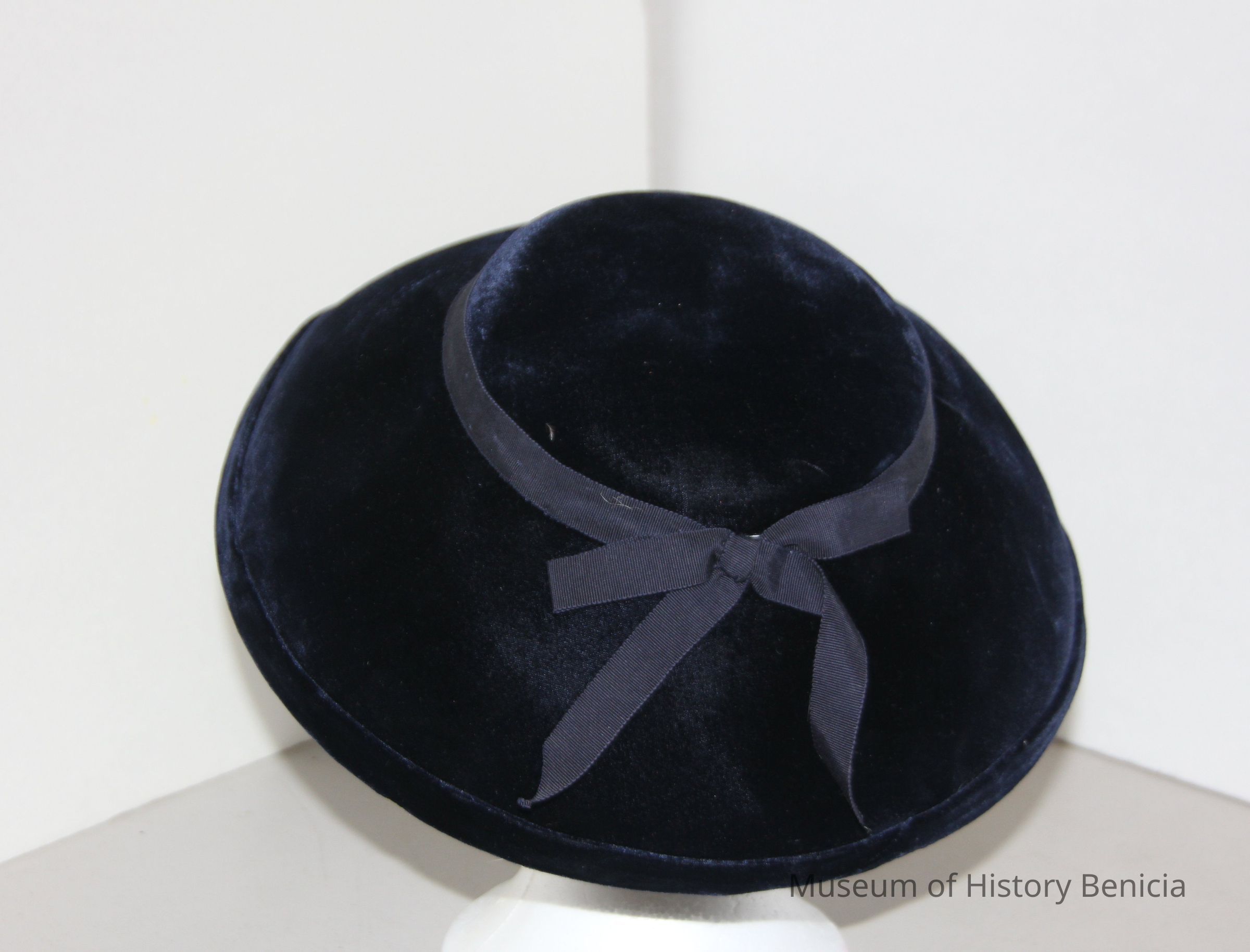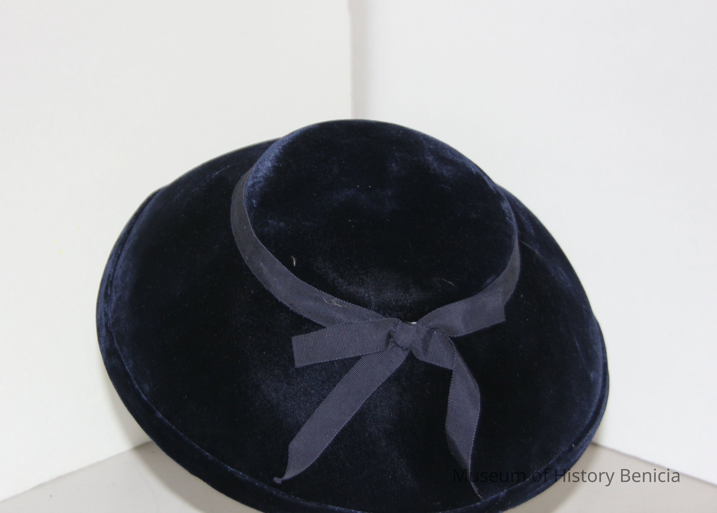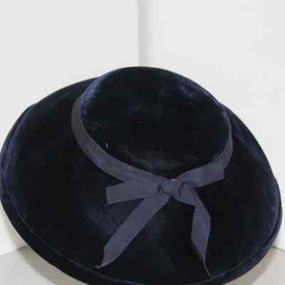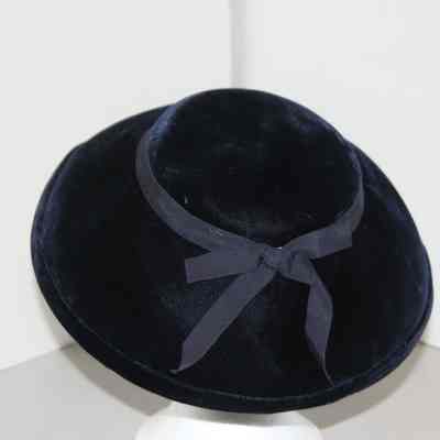 Dark blue/Navy velvet pillbox with wide brim, grossgrain hat band plus bow