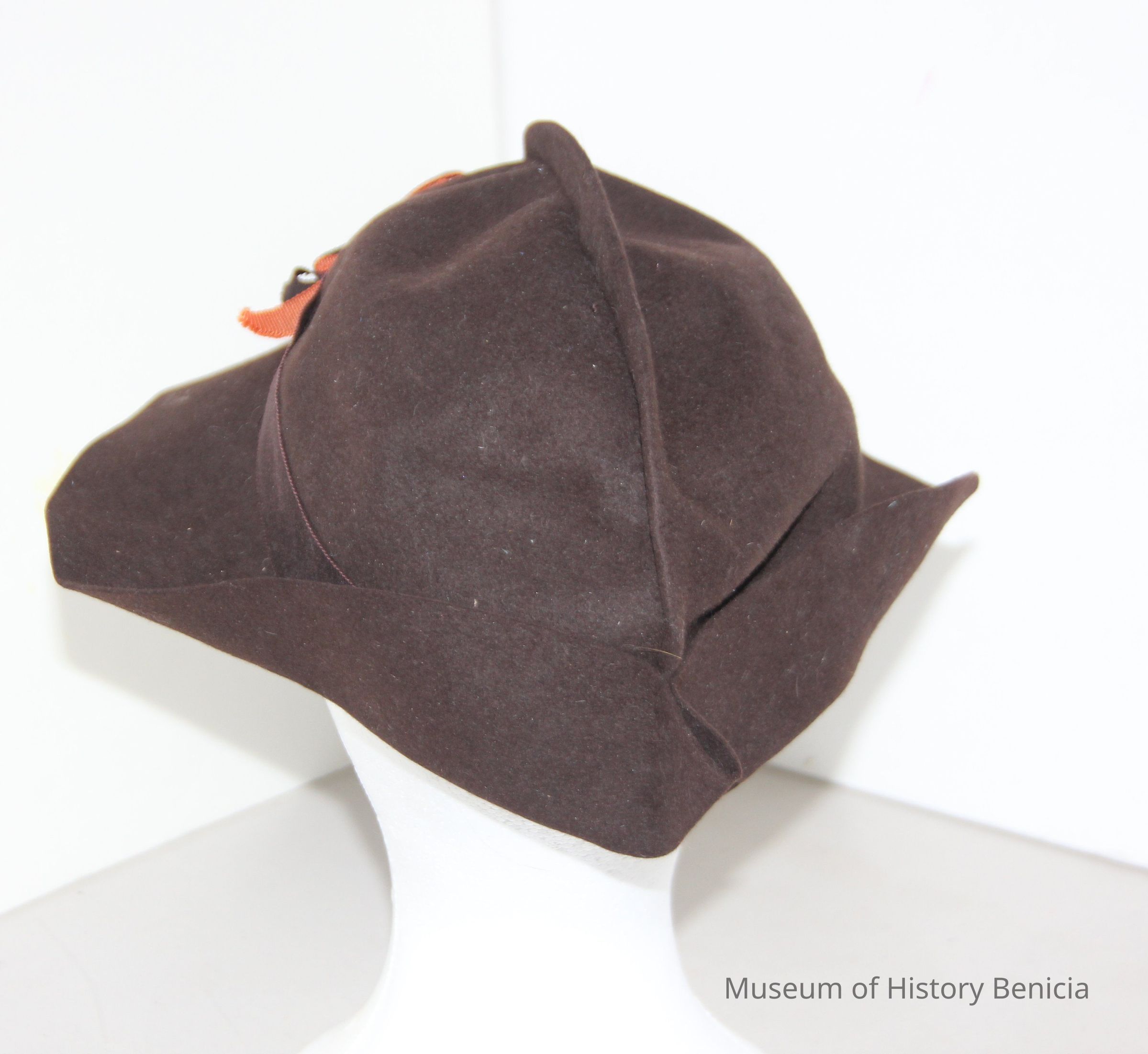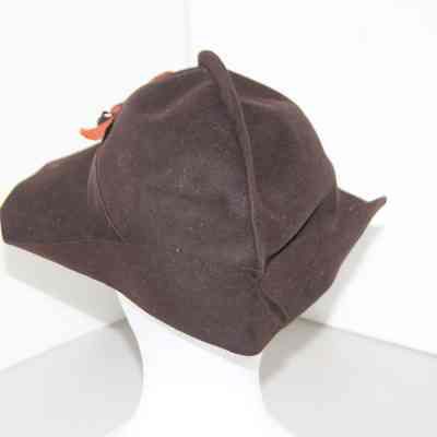Brown felt hat with small brim with brown and orange ribbon.