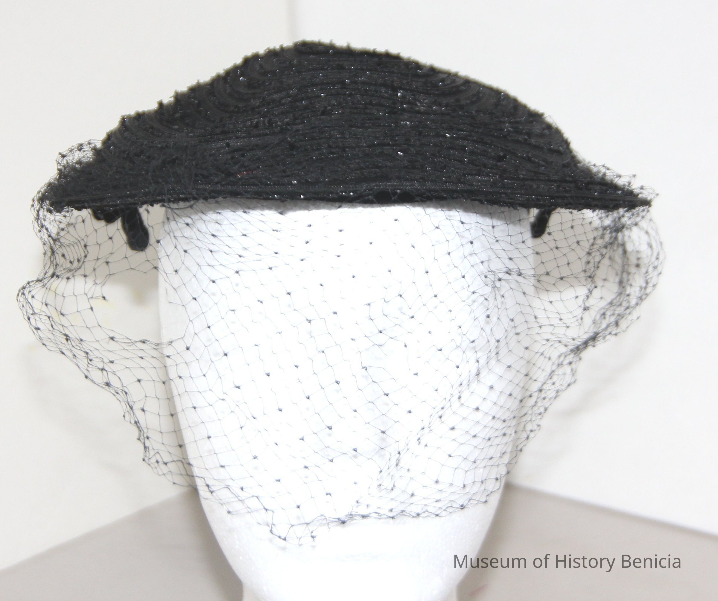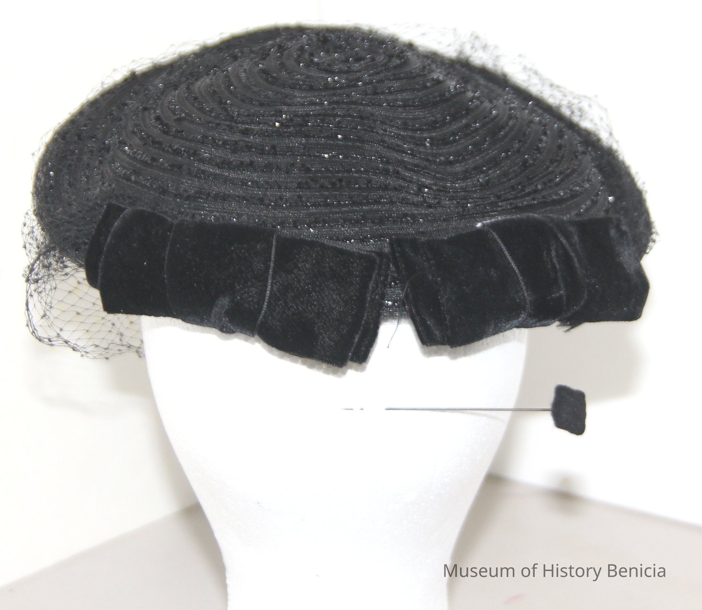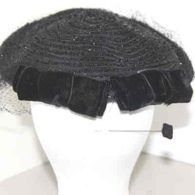 Black pancake hat with black veil and two velvet bows in back and a hat pin.