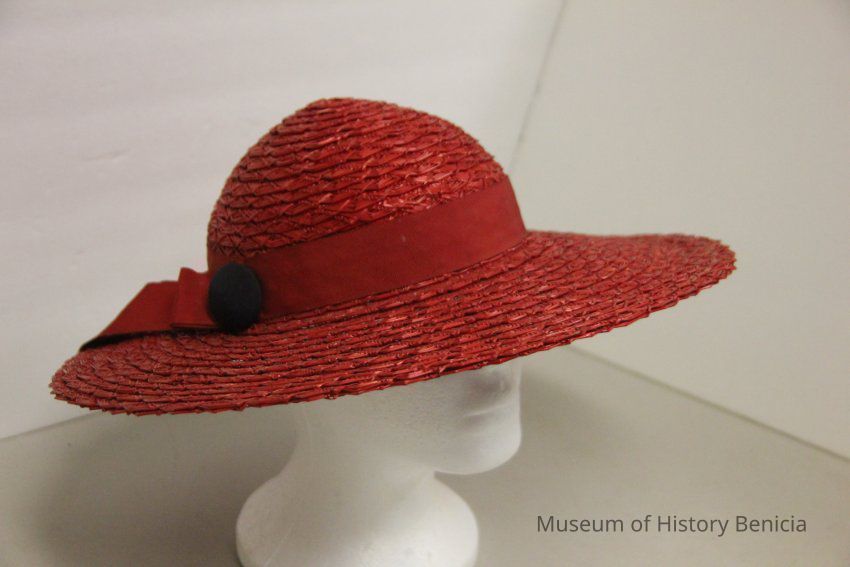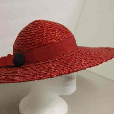 Large orange brimmed straw hat.