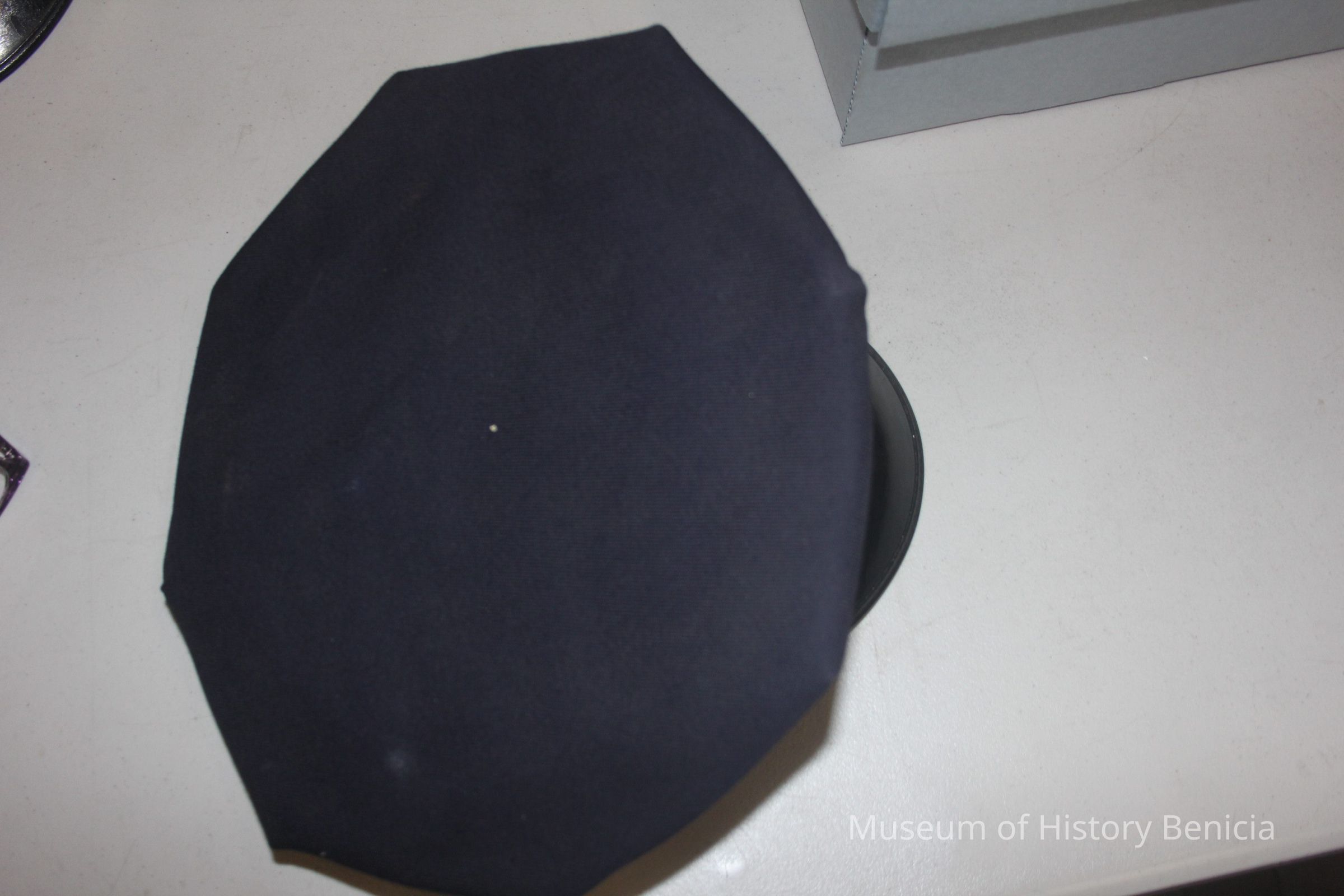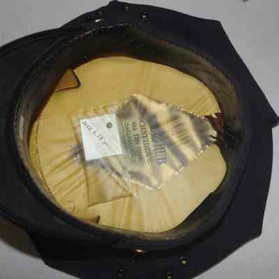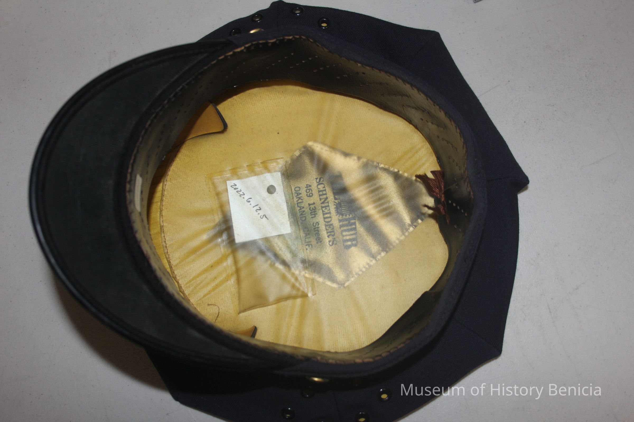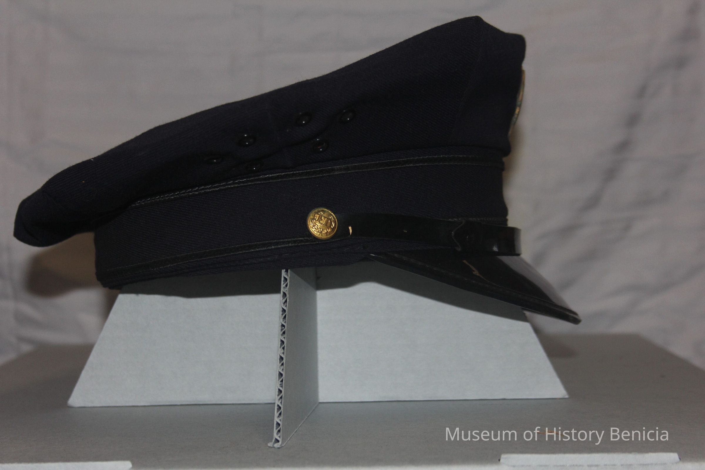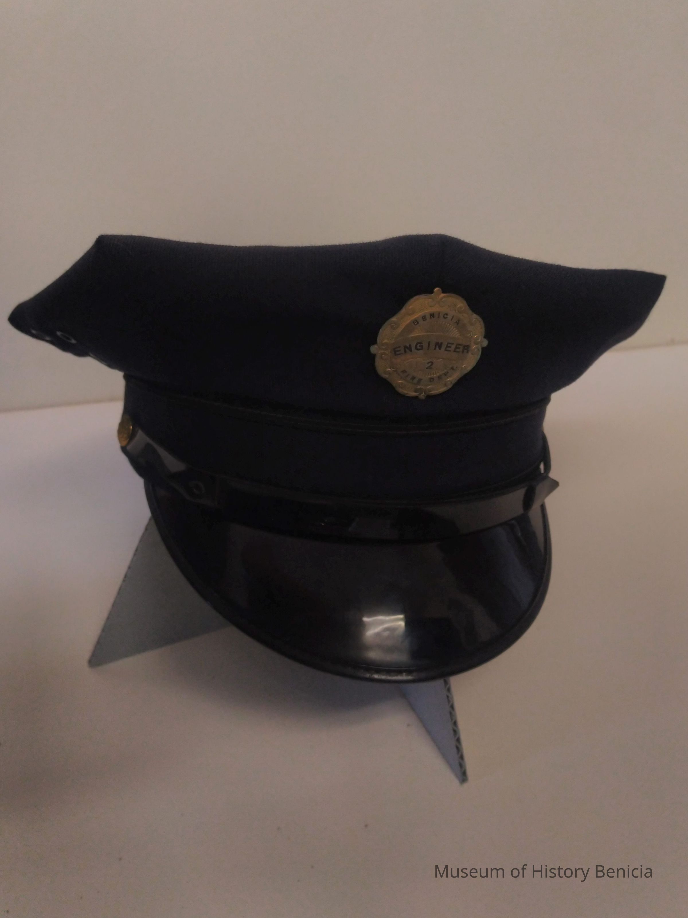 Blue wool Bneicia Fire Dept Station Hat - The Hub Schneider's 469 13th st Oakland CA - Brass Fire Dept Engineer 2 screwback hat badgeCollection