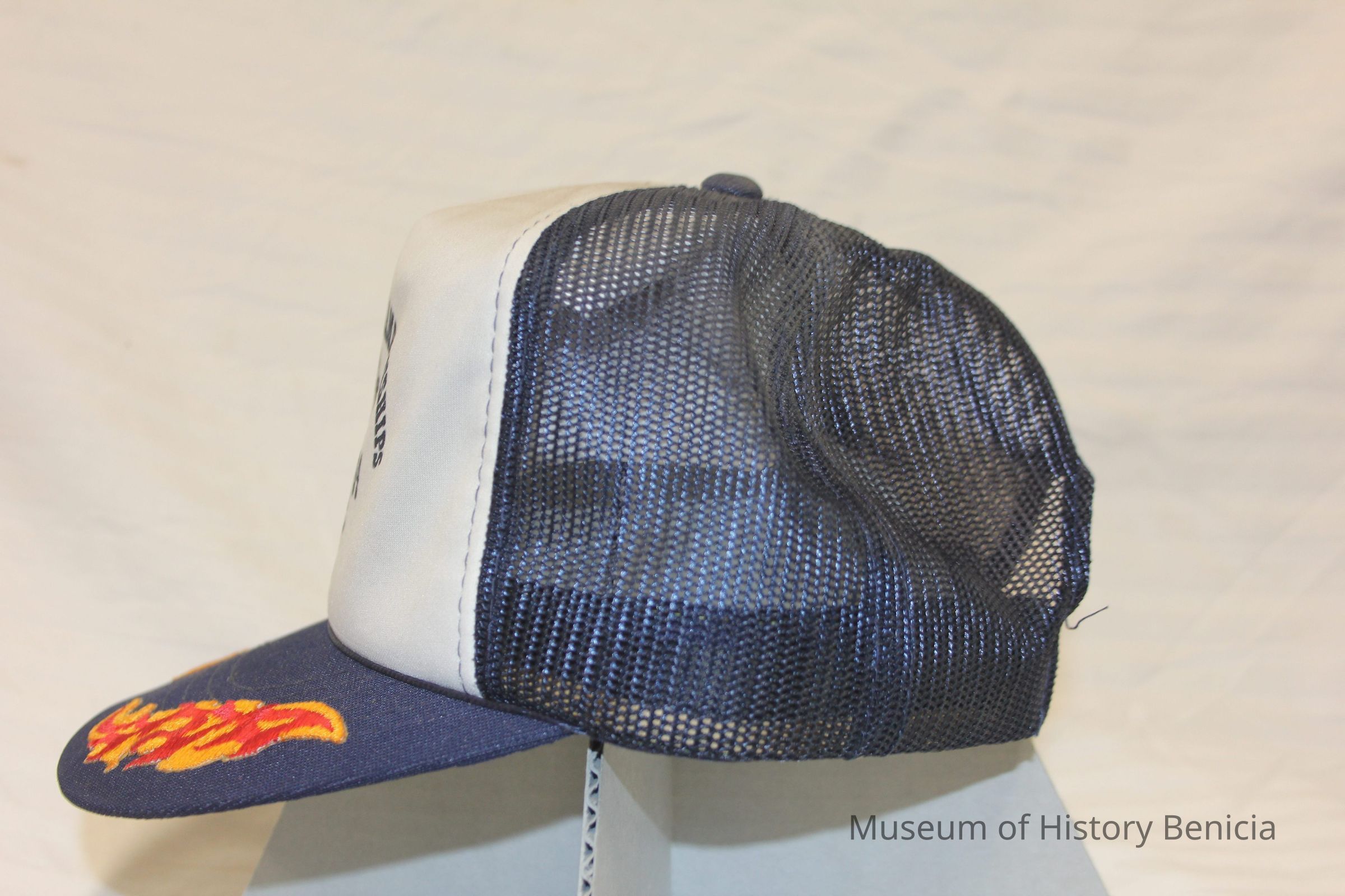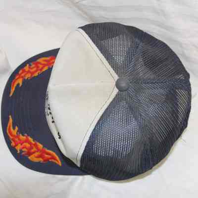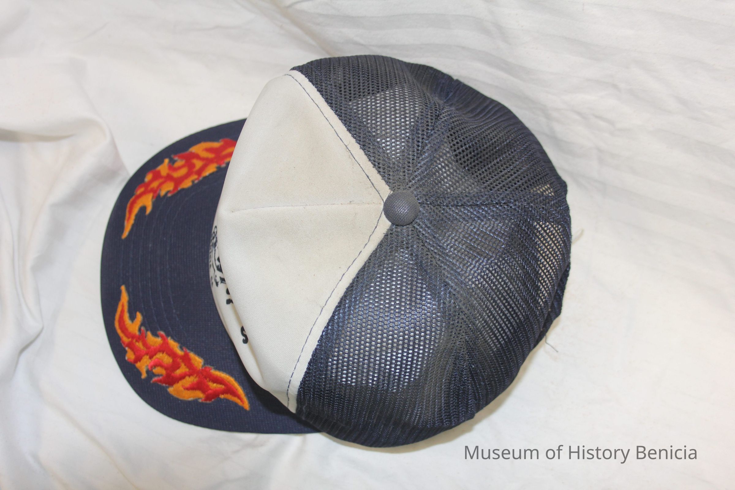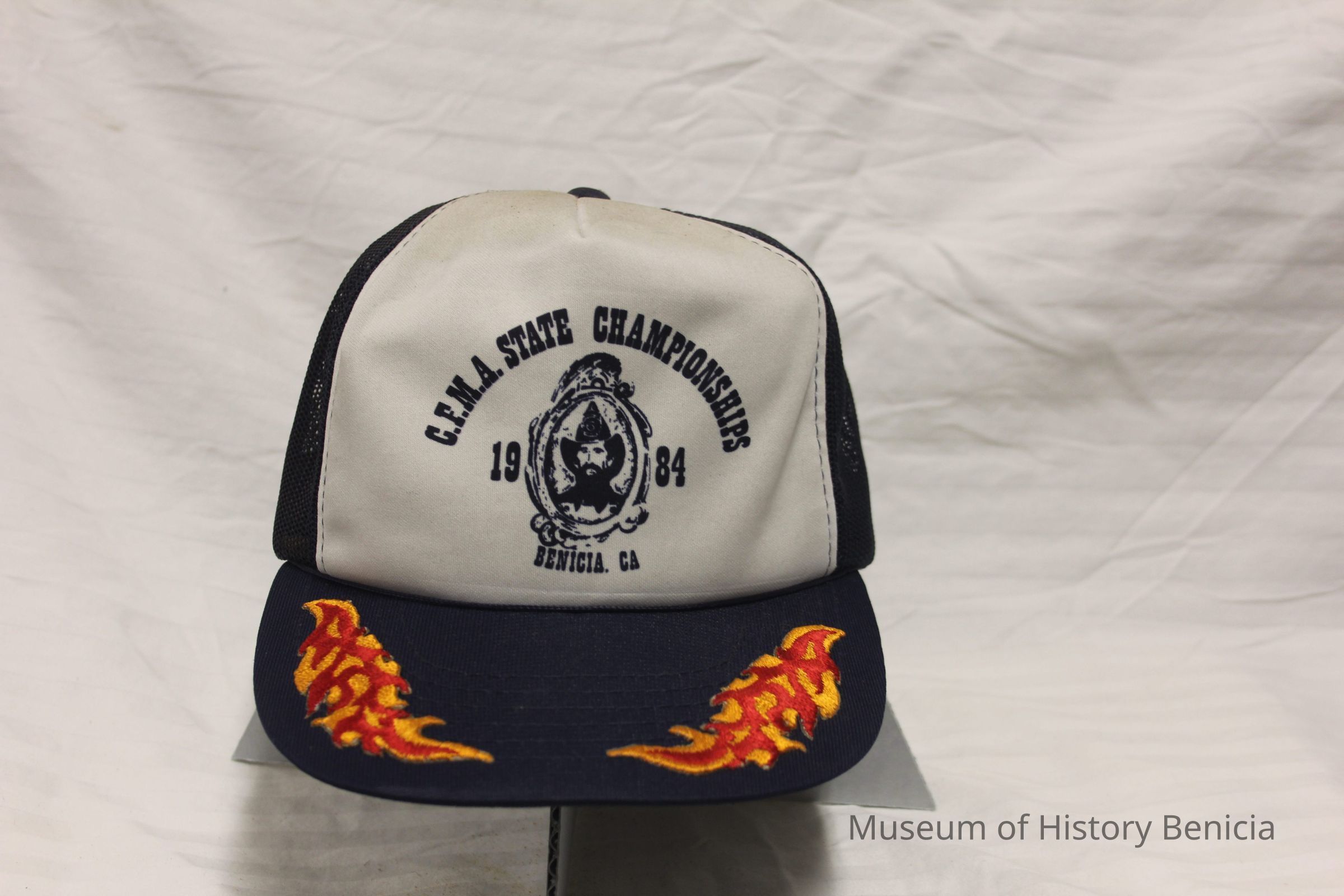Blue and White Nylon and Plastic Trucker style baseball cap with patches of flames - White front with C.F.M.A. State Championship 1984 Benicia CA