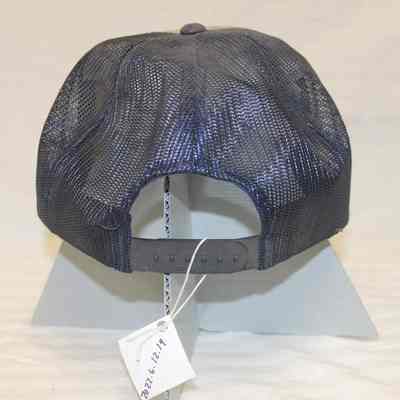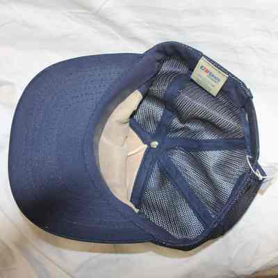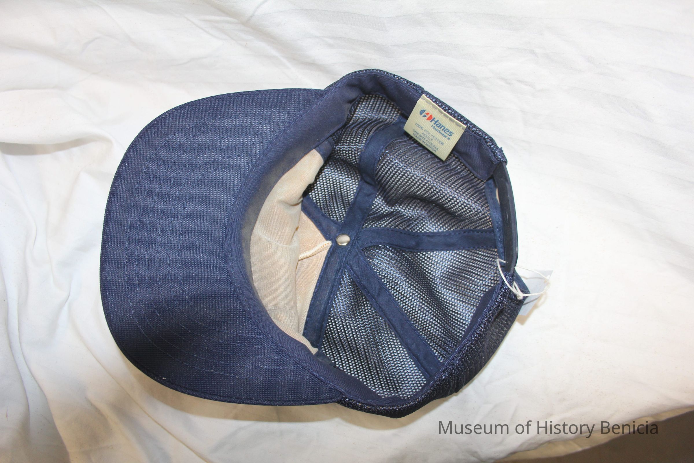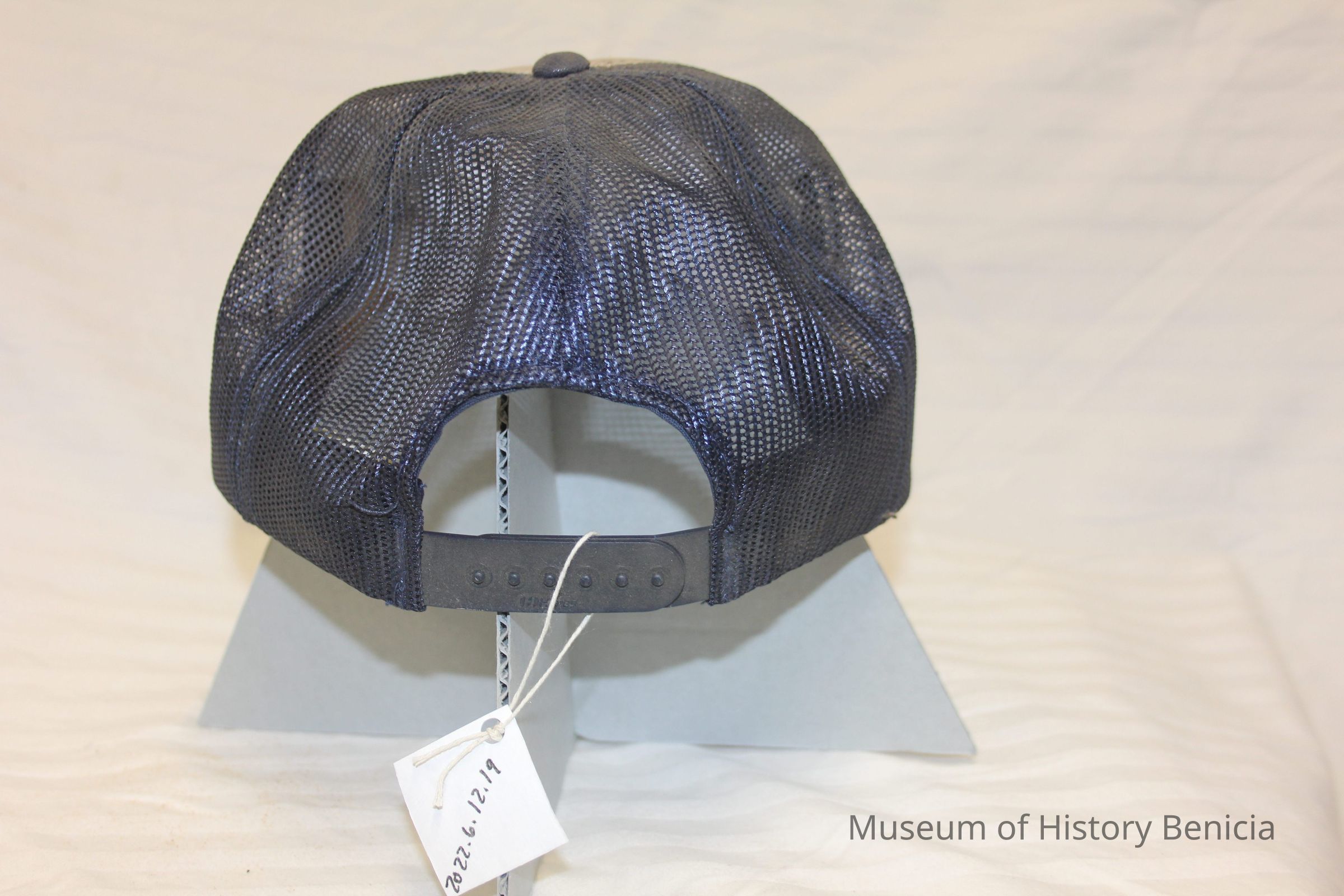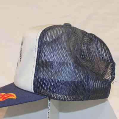Blue and White Nylon and Plastic Trucker style baseball cap with patches of flames - White front with C.F.M.A. State Championship 1984 Benicia CA