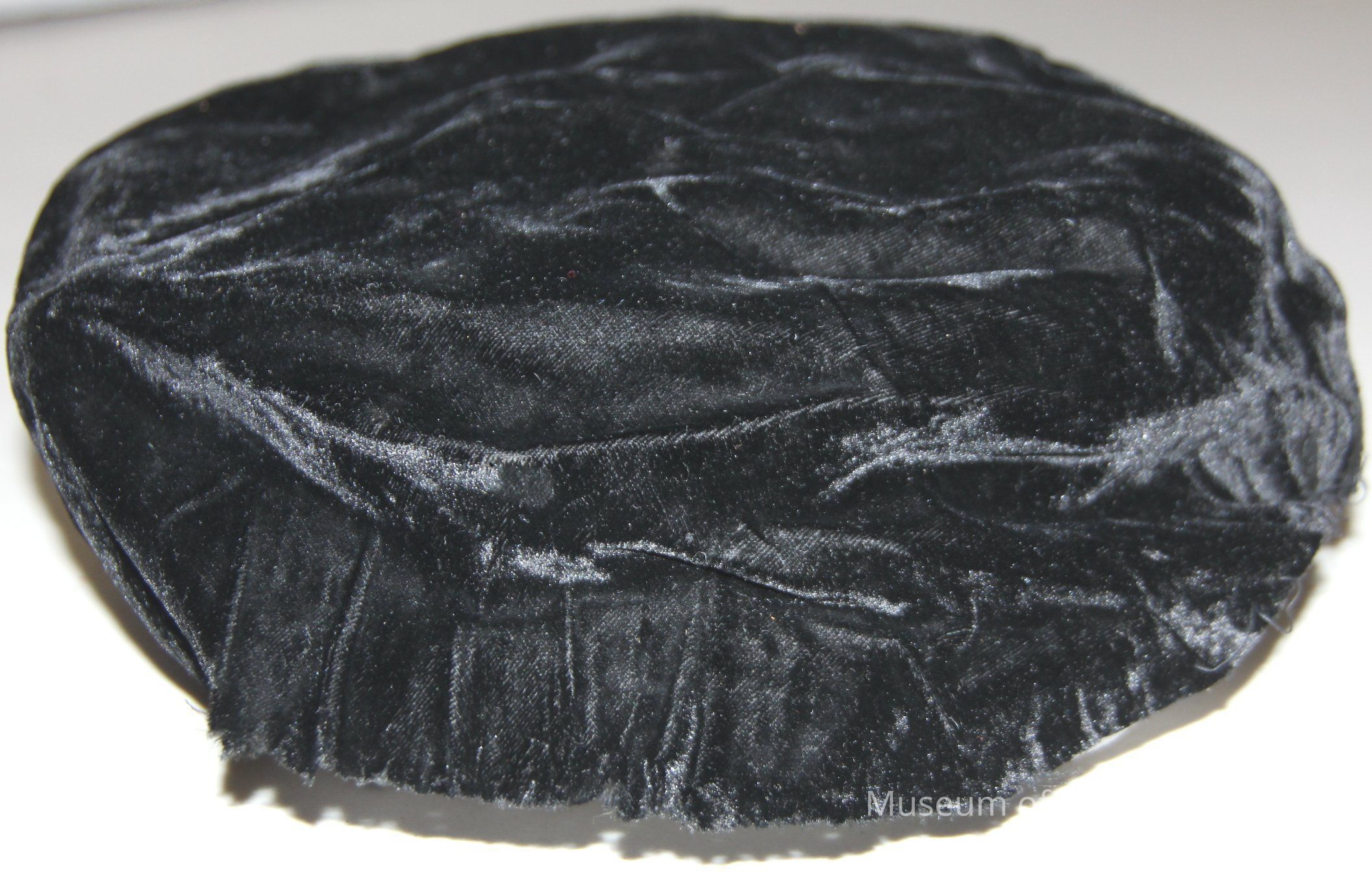 Unfinished or remnant from alteration; black velvet cap piece with woven lining (2 layers); gathered at edge -- stitching undone for about half of circumfance.
