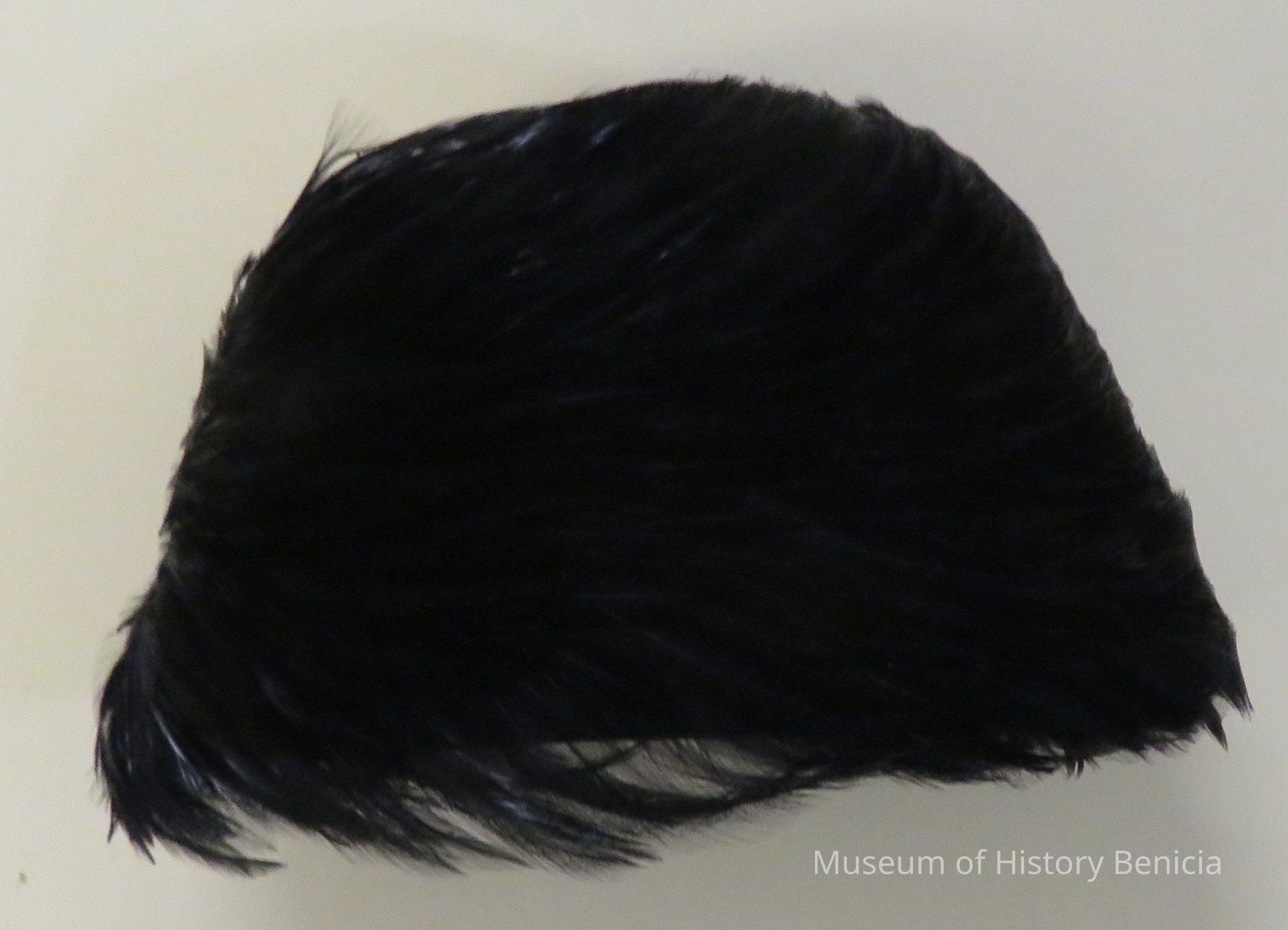 Black feathered cloche hat with label "I.Magnin & Co." inside. The hat is covered with black narrow feathers that swirl all the way around and over the top. It is attached to a felt base and ribbon band. It is approximately 7 1/2" inches wide and 9" in diameter.Collection