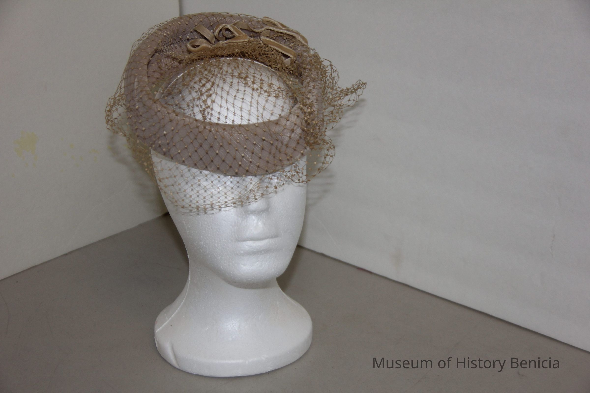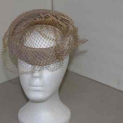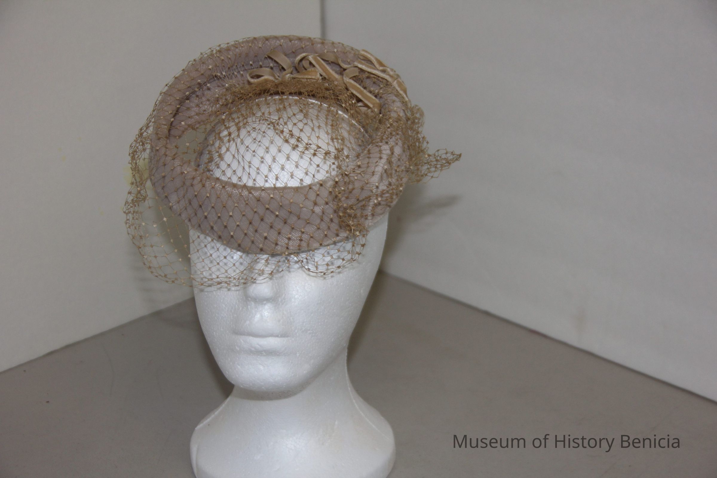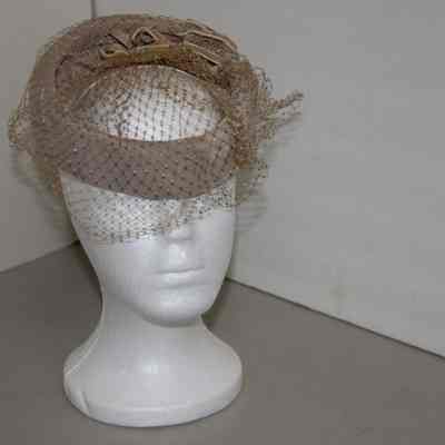 1950's hat, Beige velvet open ring with three small velvet bows and beige netting.