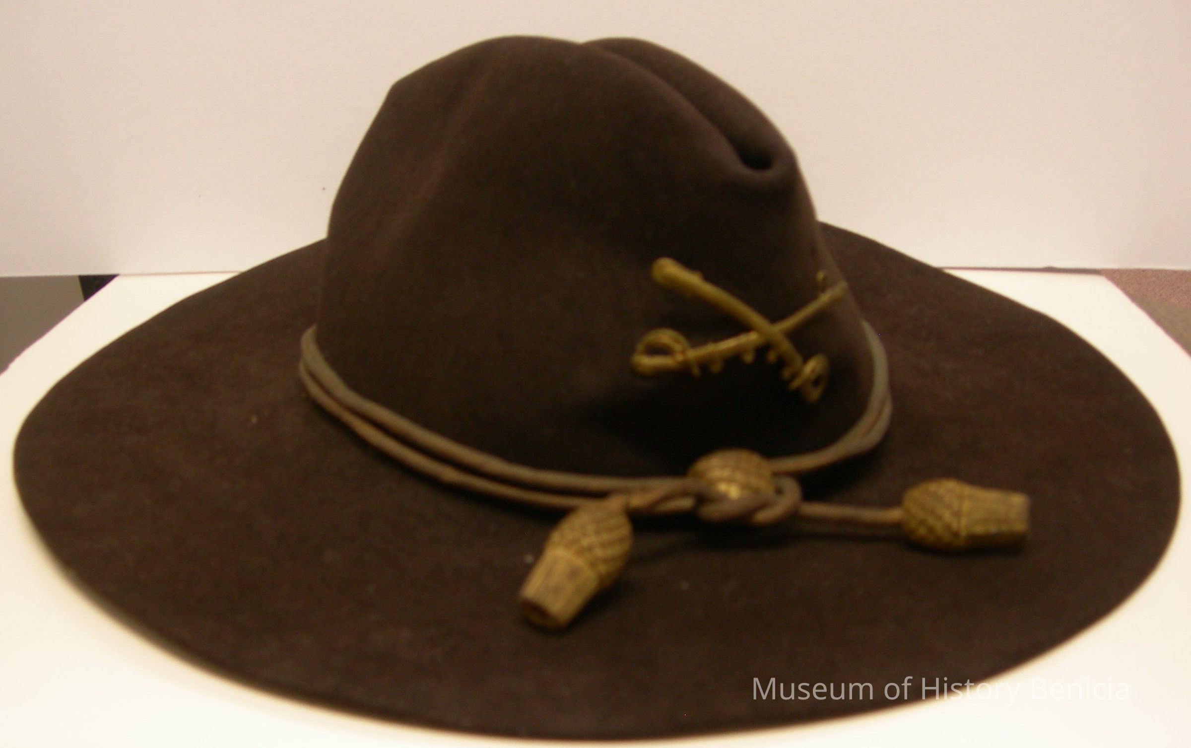 Hat - Reproduction Civil War Cavalry Officer's Slouch Hat, black with 4" wide brim; has discolored yellowish cavalry cord around and tied in front; crossed sabers insignia is attached to the front; leather band inside; there is no size tag;