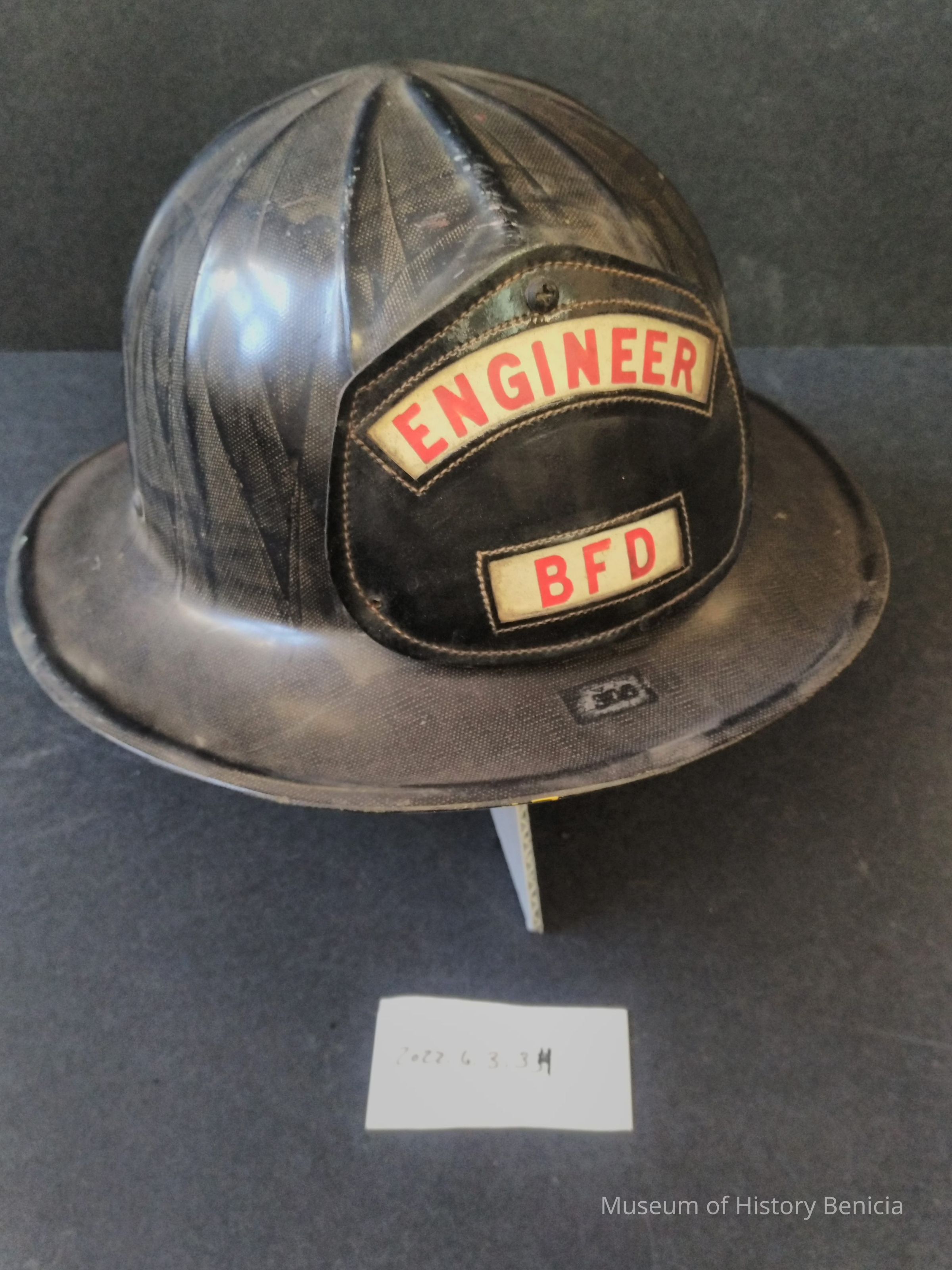 Black fiberlgass fire helmet with black lether BFD Engineer helmet shield on front - internal suspension and webbing intact - Ron Rice 1954 in pen on underside or brim at rear - Lables intact.Collection