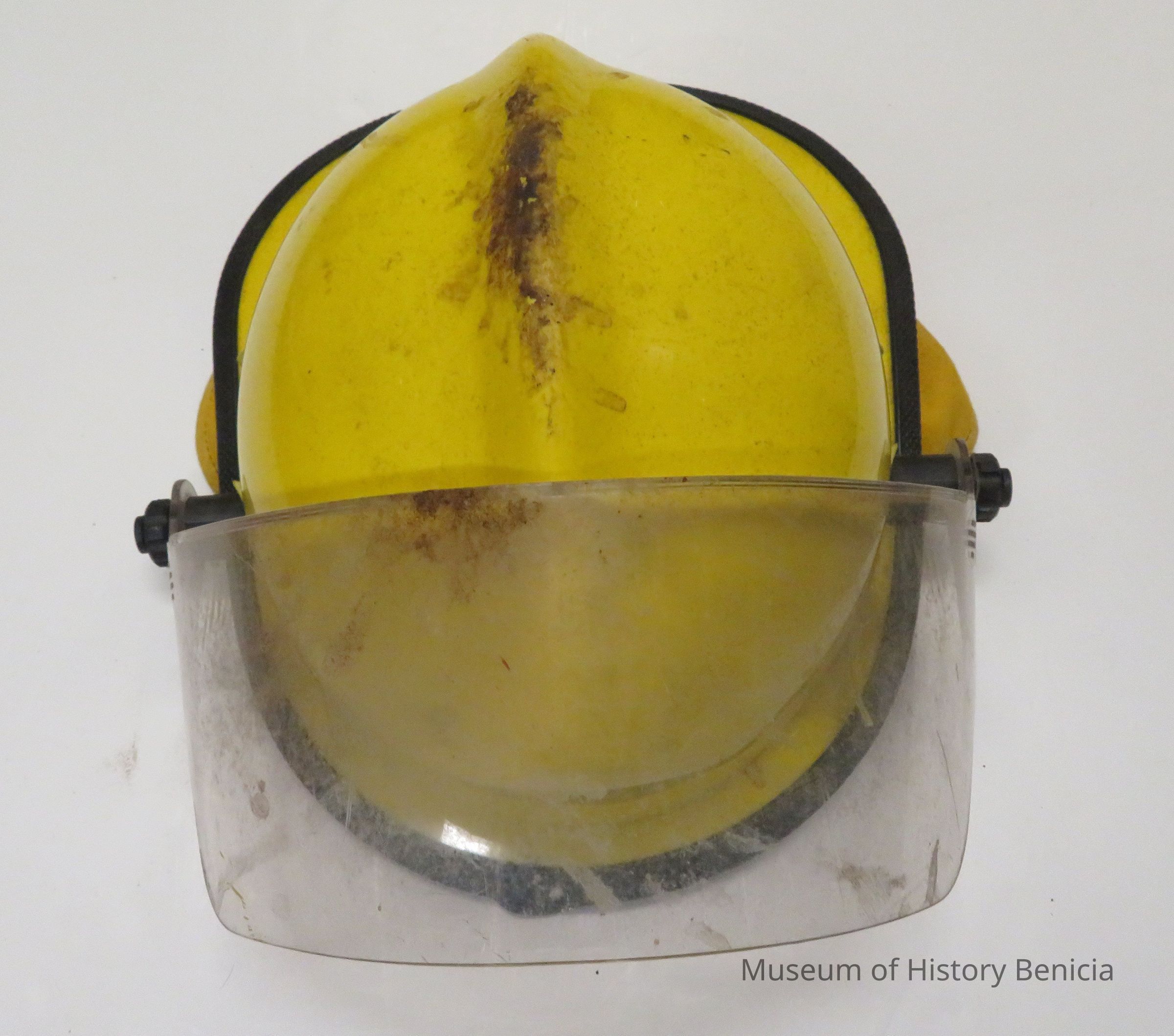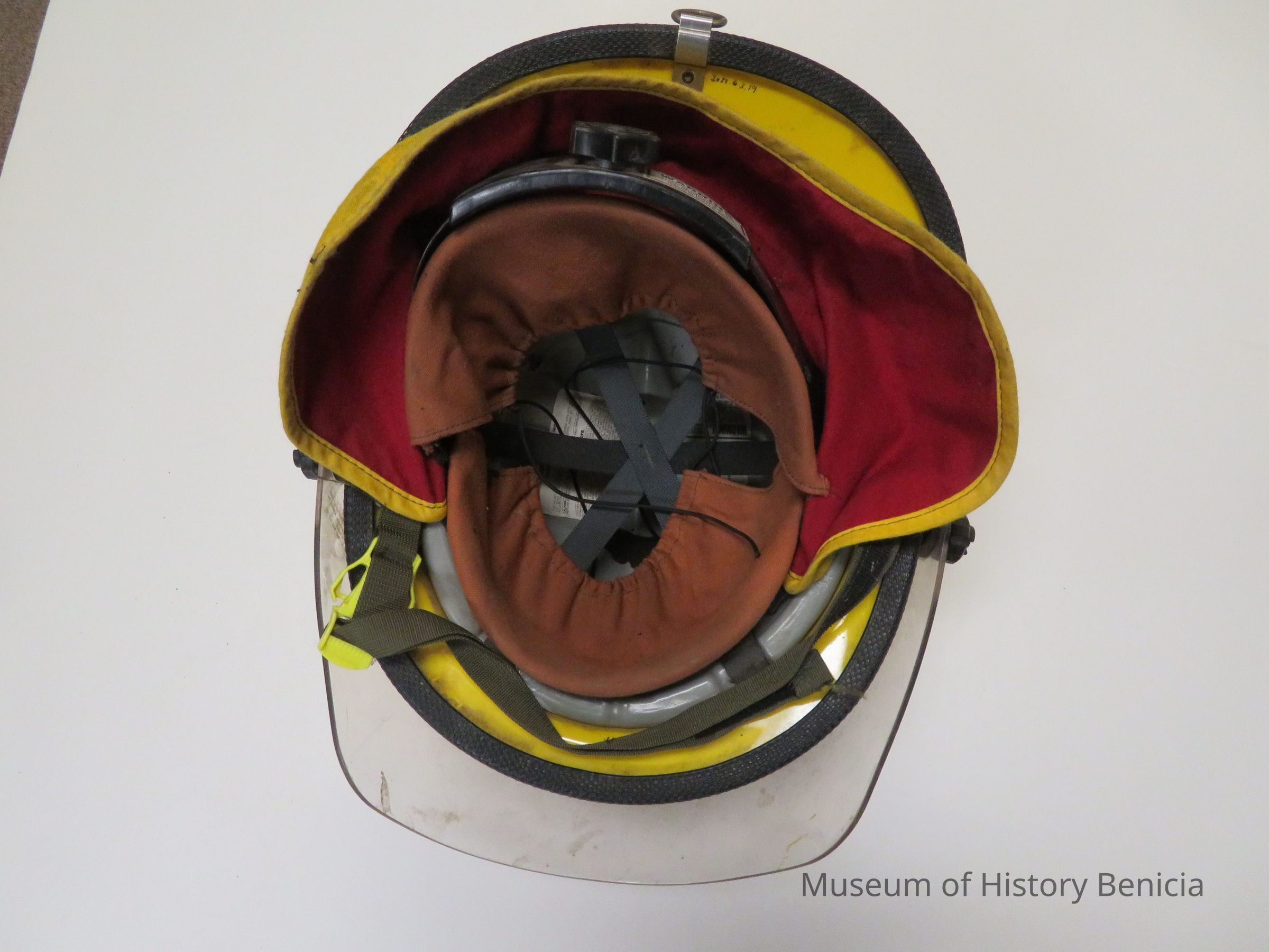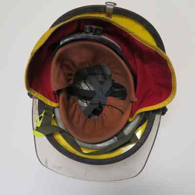 Yellow helmet with goggles "Firefighter Vkolunteer" #39 with neck protector and blacklining.
