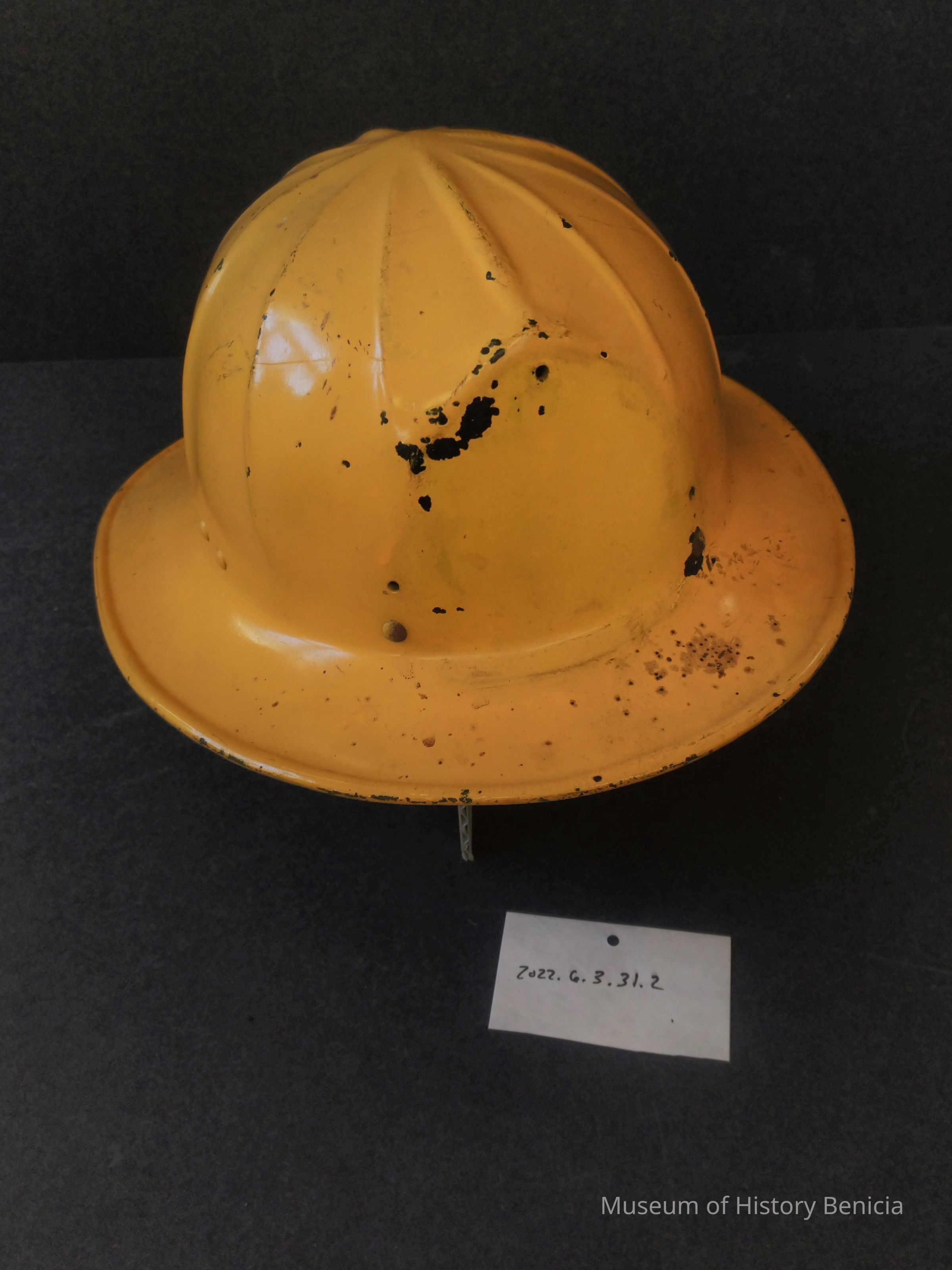 Yellow fiberglass fire helmet - missing front helmet shield - internal webbing and suspension intact - internal labeling intact - ID'd to Jones