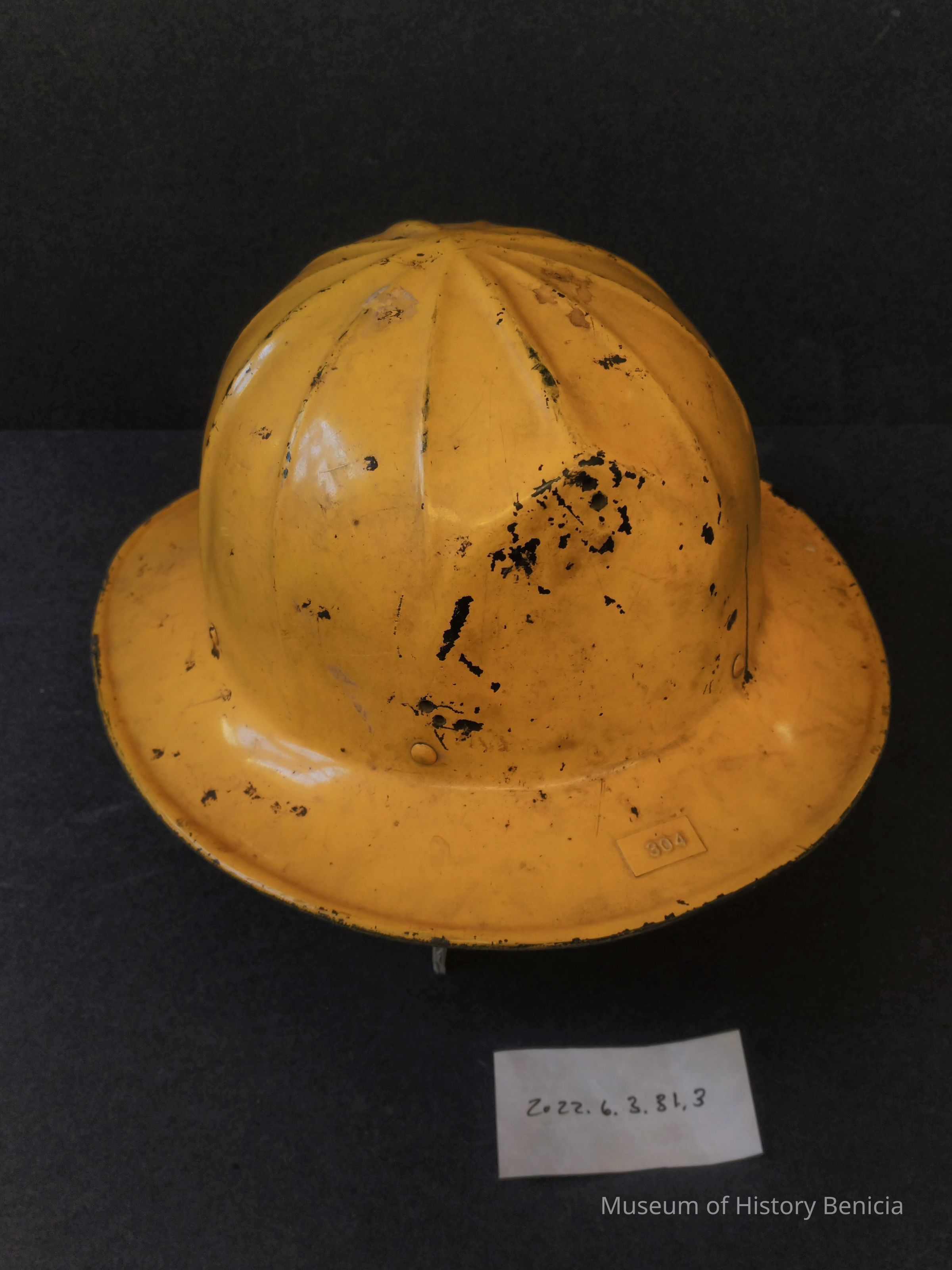 Yellow fiberglass fire helmet with intact interior suspension and webbing - Paper interior lables - 3 names listed, Turner probably the first issue, Howard, probably the 2nd and Higgins, probably the 3rd -Collection