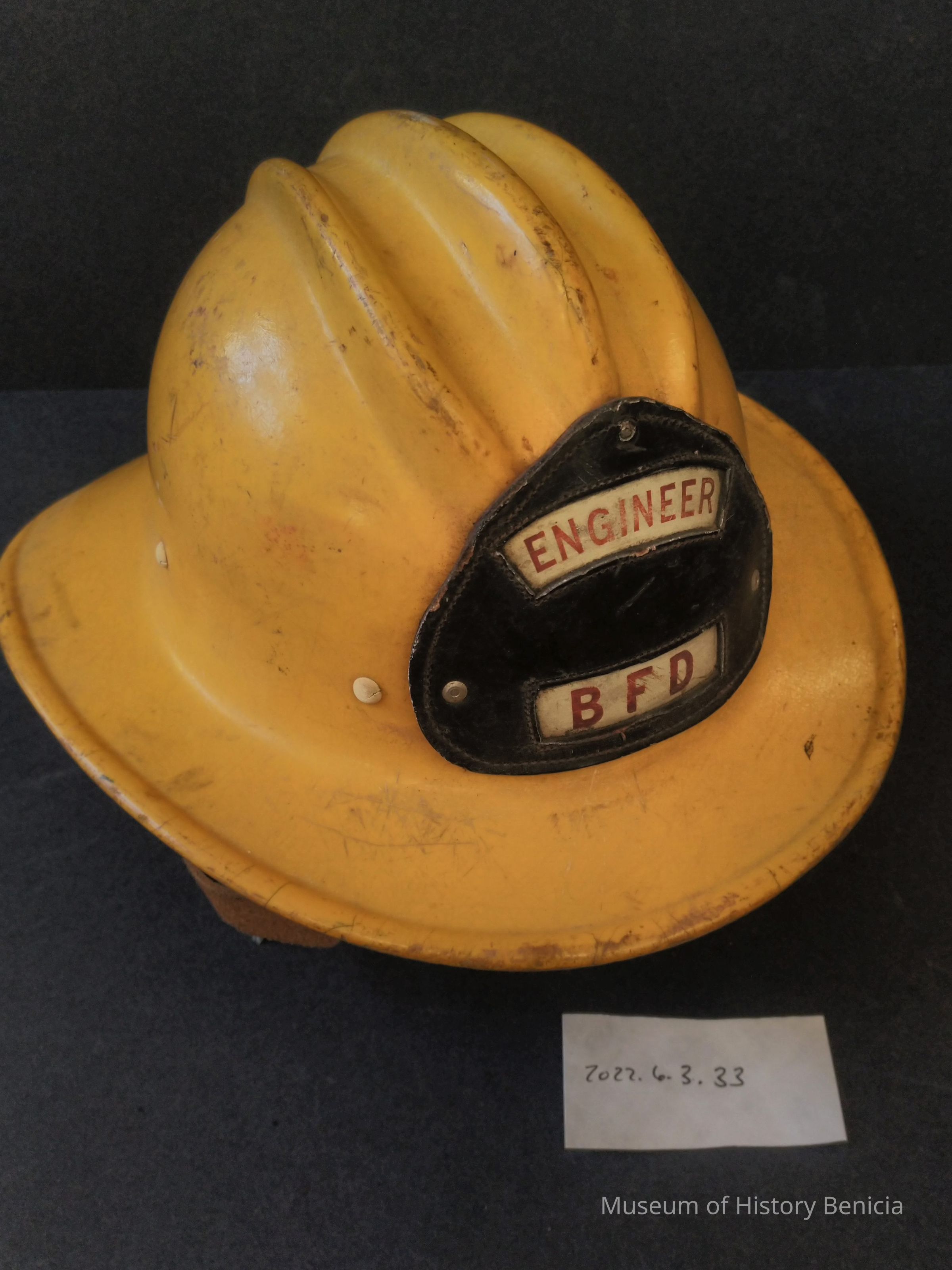 Yellow fiberglass Hard Boild Fire helmet - suspension and webbing intact - leather and metal chin strap intact - paper lables intact Black leather BFD Engineer helmet shield on front - pen mark inside ForsythCollection