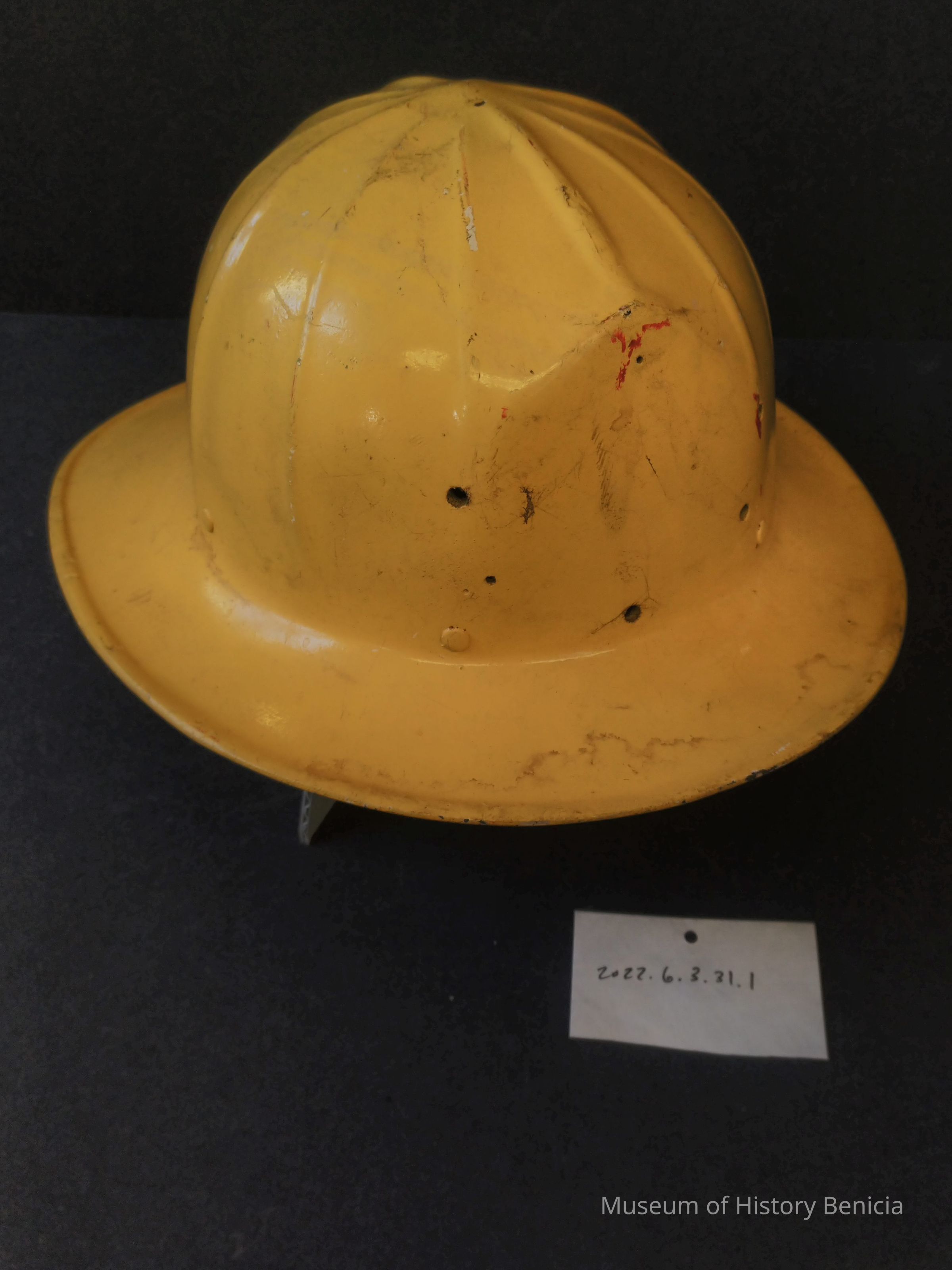 Yellow fiberglass fire helmet with intact suspenions and chin strap - missing helmet sheld