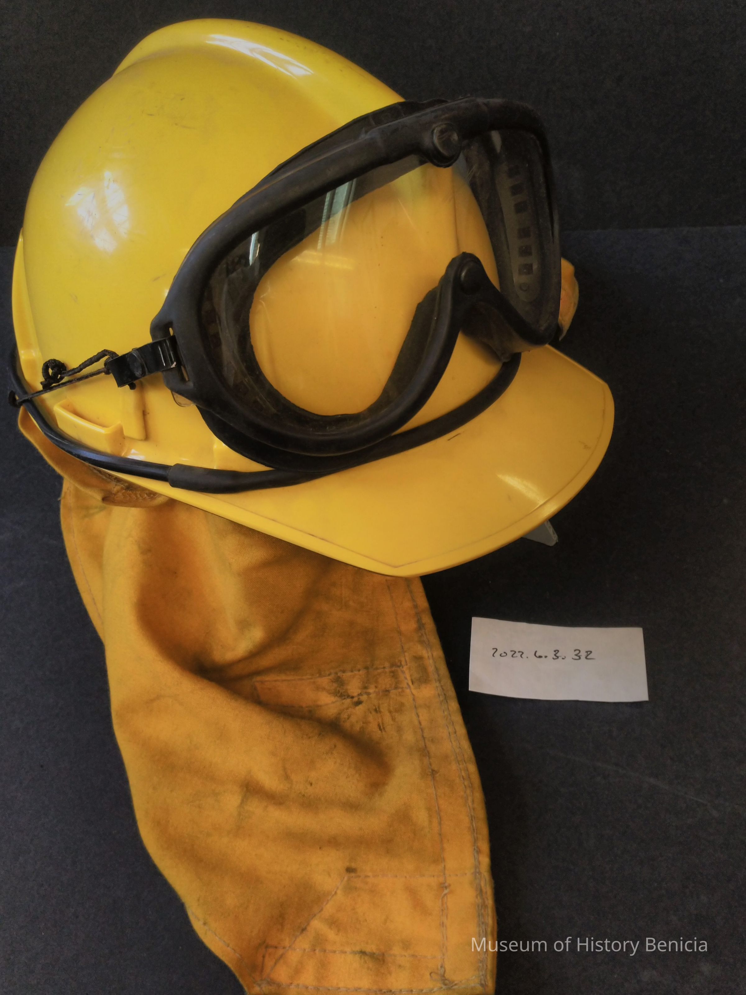 Yellow wildland fire helmet with fabric drape and goggles - interior webbing and suspension intact - Marked with Steve Alvorado Stat. #2 Blood Type A Neg No Allergies - Etcued on inside of brim Benicia Vol. FiremanCollection