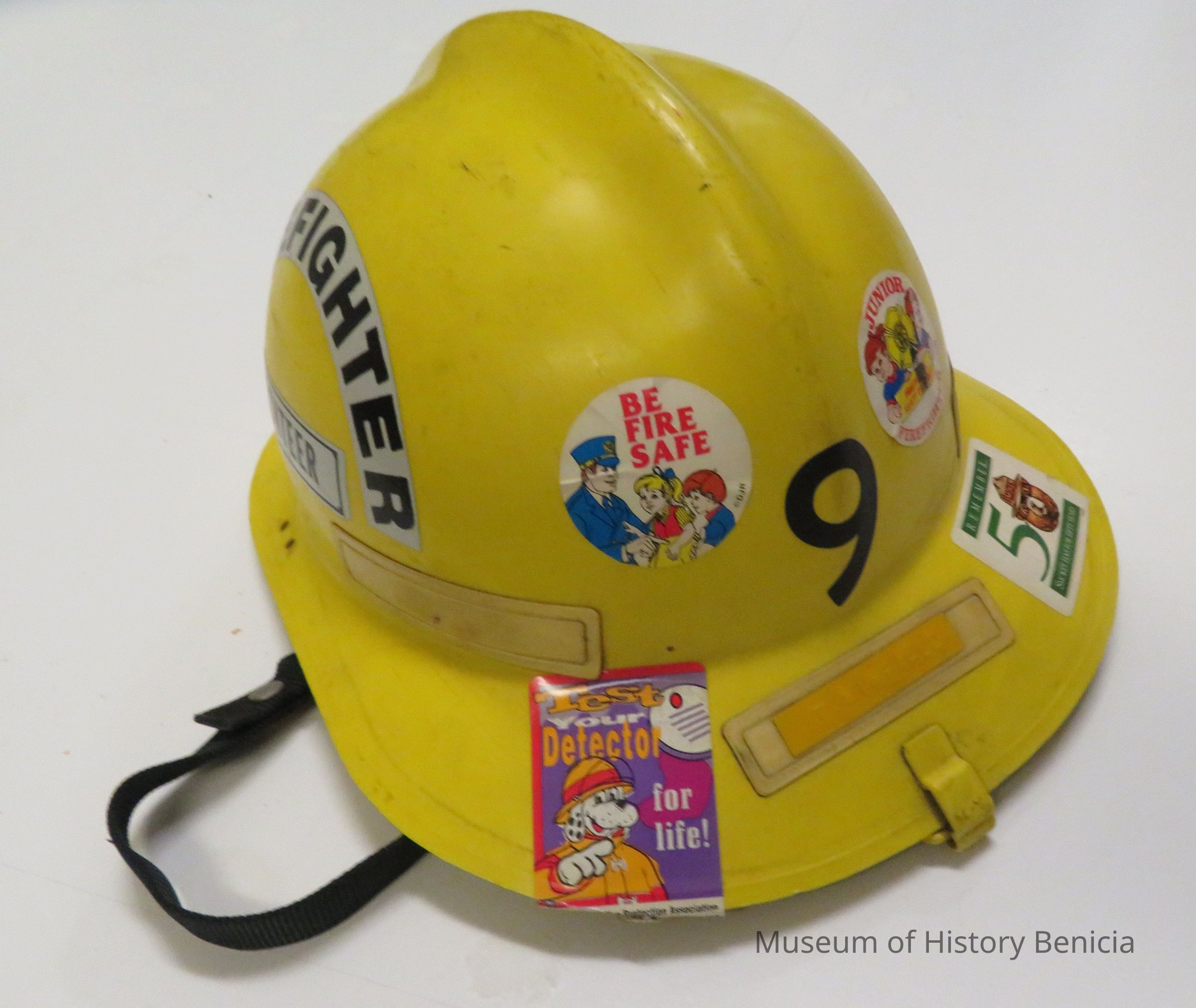 Yellow helmet with "Firefighter Volunteer". Has black webbing for protection. Made of hard plastic.