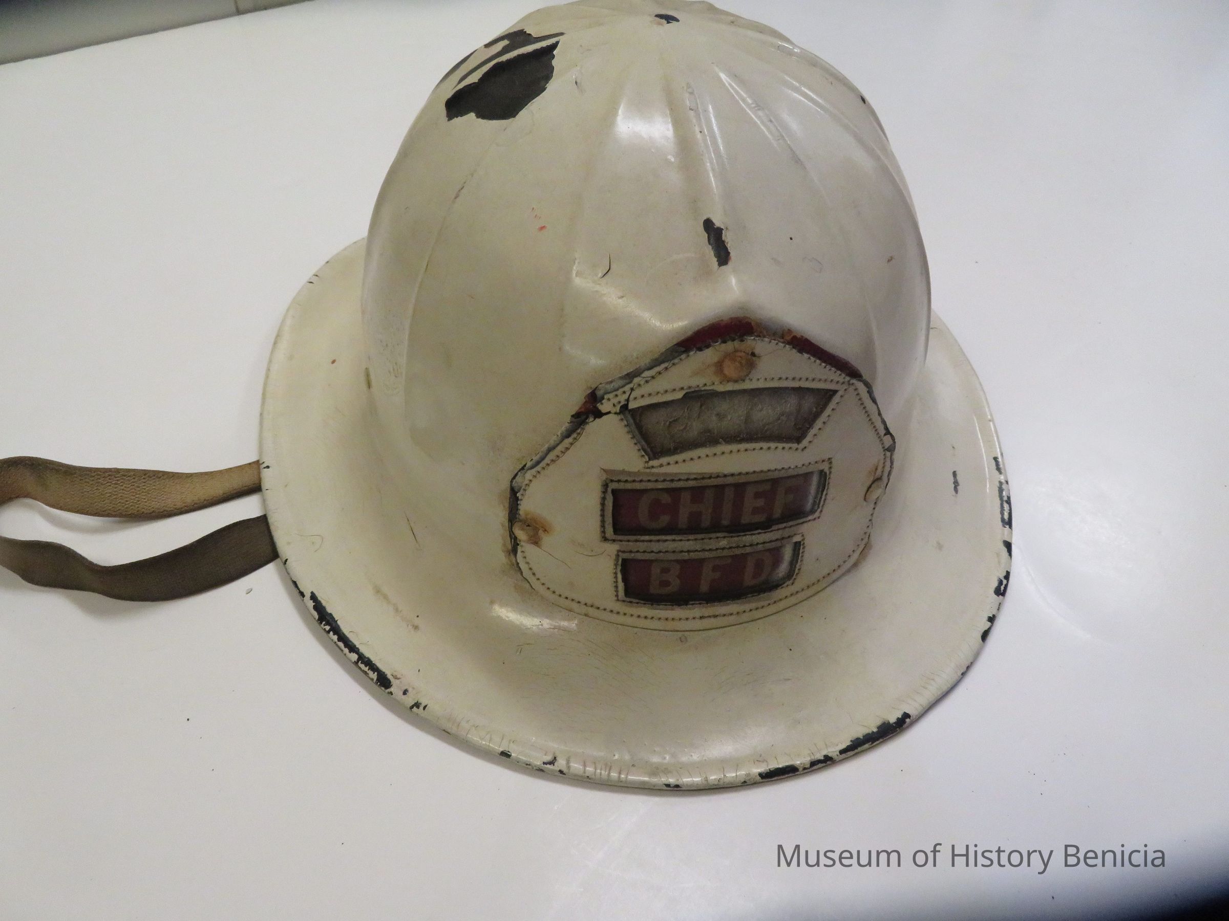 White BFD Chief helmet with material chinstrap. White leather label on front reads "Chief BFD" with white letters against a red background. "Cairns and Bro., New York" on inside.