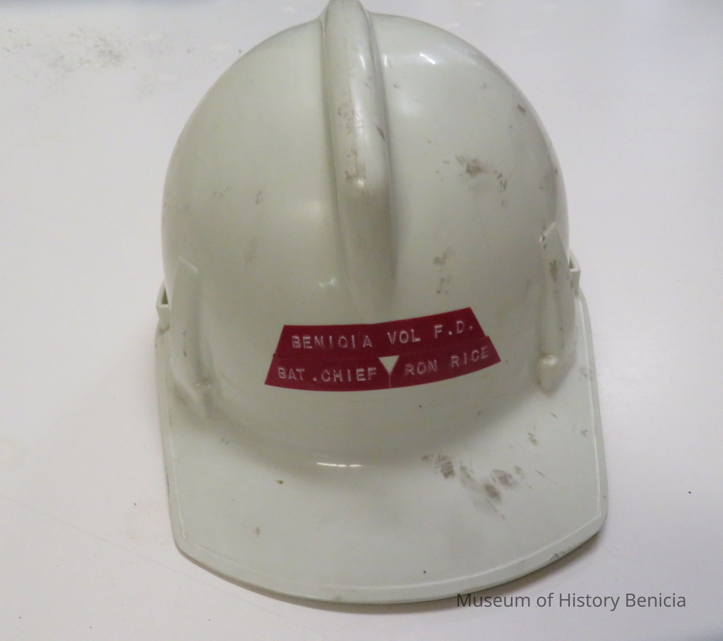 White hard hat with Dymo label on front, "Benicia Vol. F.D. Bat. Chief Ron Rice.