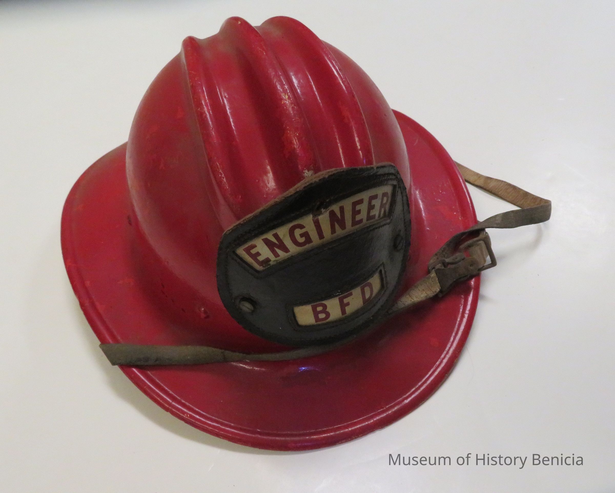 Red BFD Engineer's helmet with black leather label on front and wording "Engineer" and "BFD" red on white. Maker's mark "E D Bullard Company" on inside. "Hard Boiled" is engraved above it.