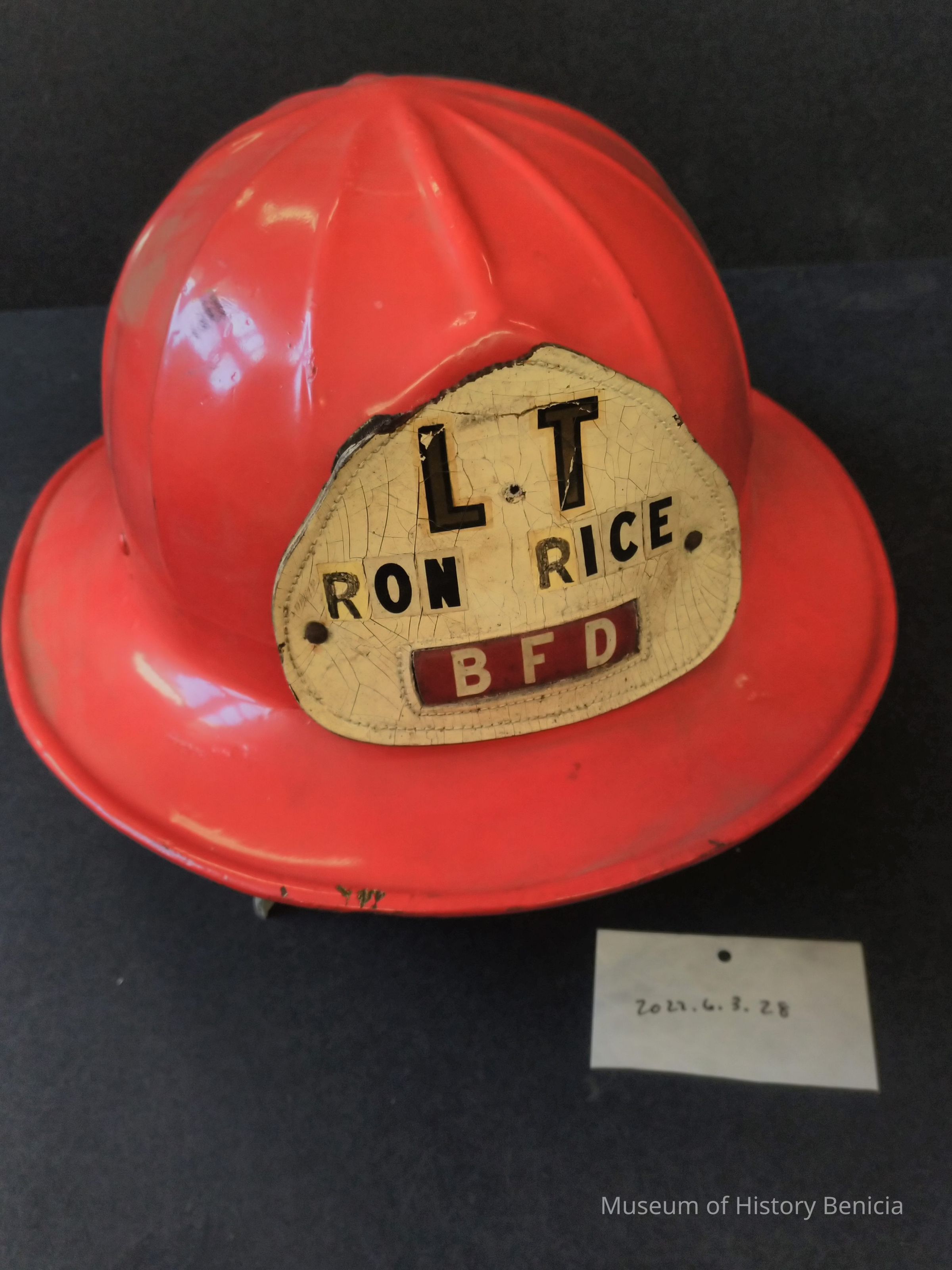 Red fiberglass fire helmet - helmet shield white leather - LT Ron Rice BFD - Interior webbing/suspension intact - Ron Rice Benicia Calif. 1954 etched into inside surface near the D ring hanger.Collection