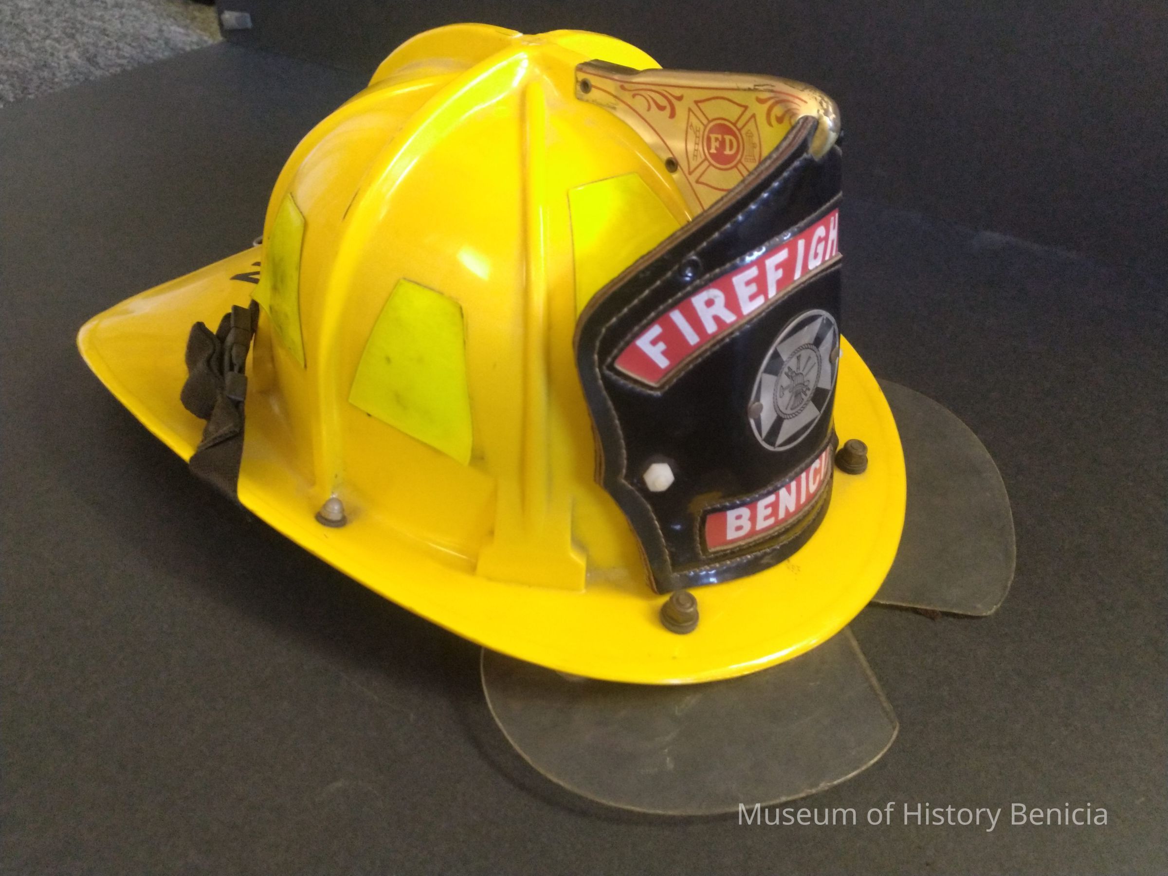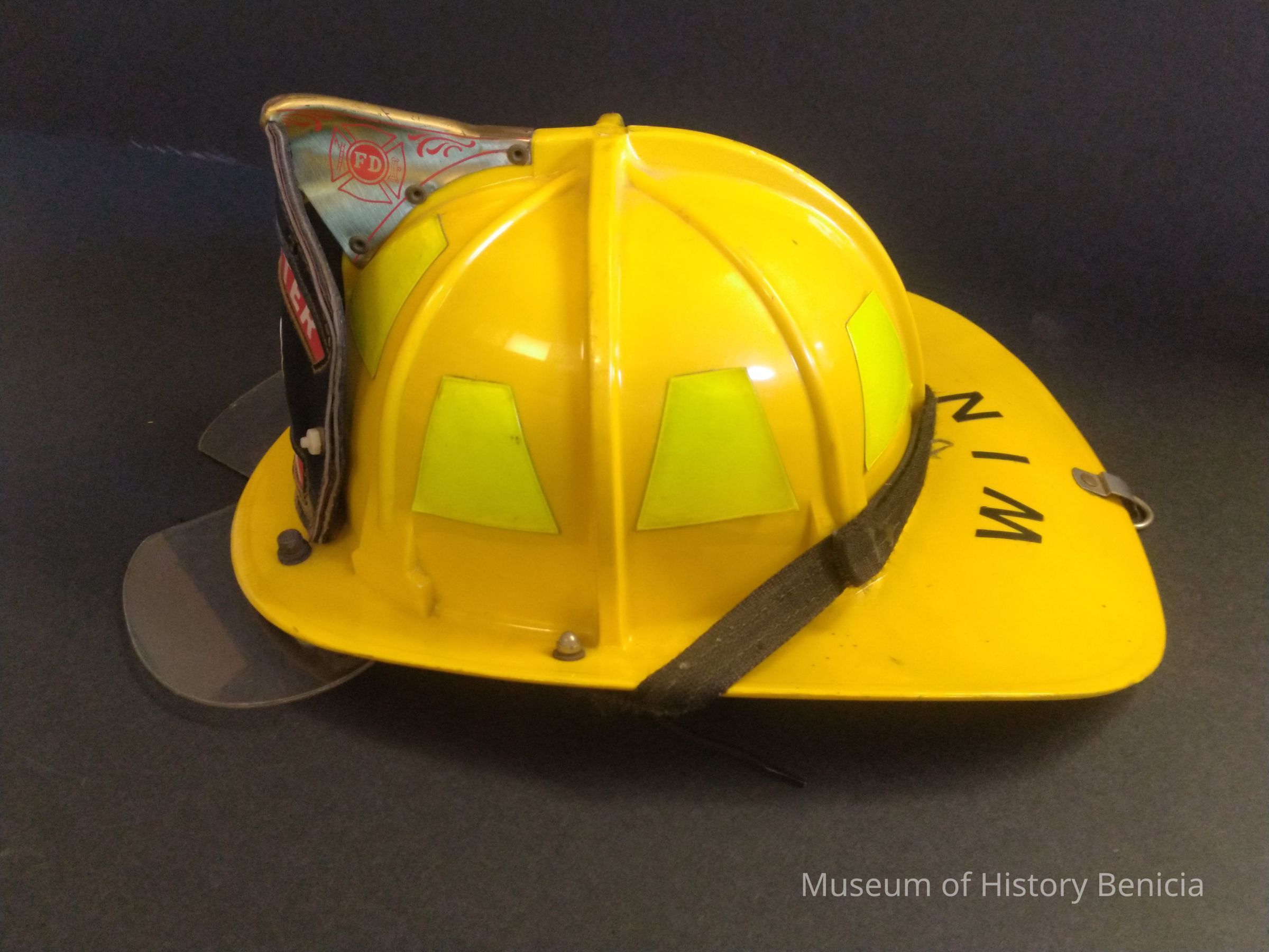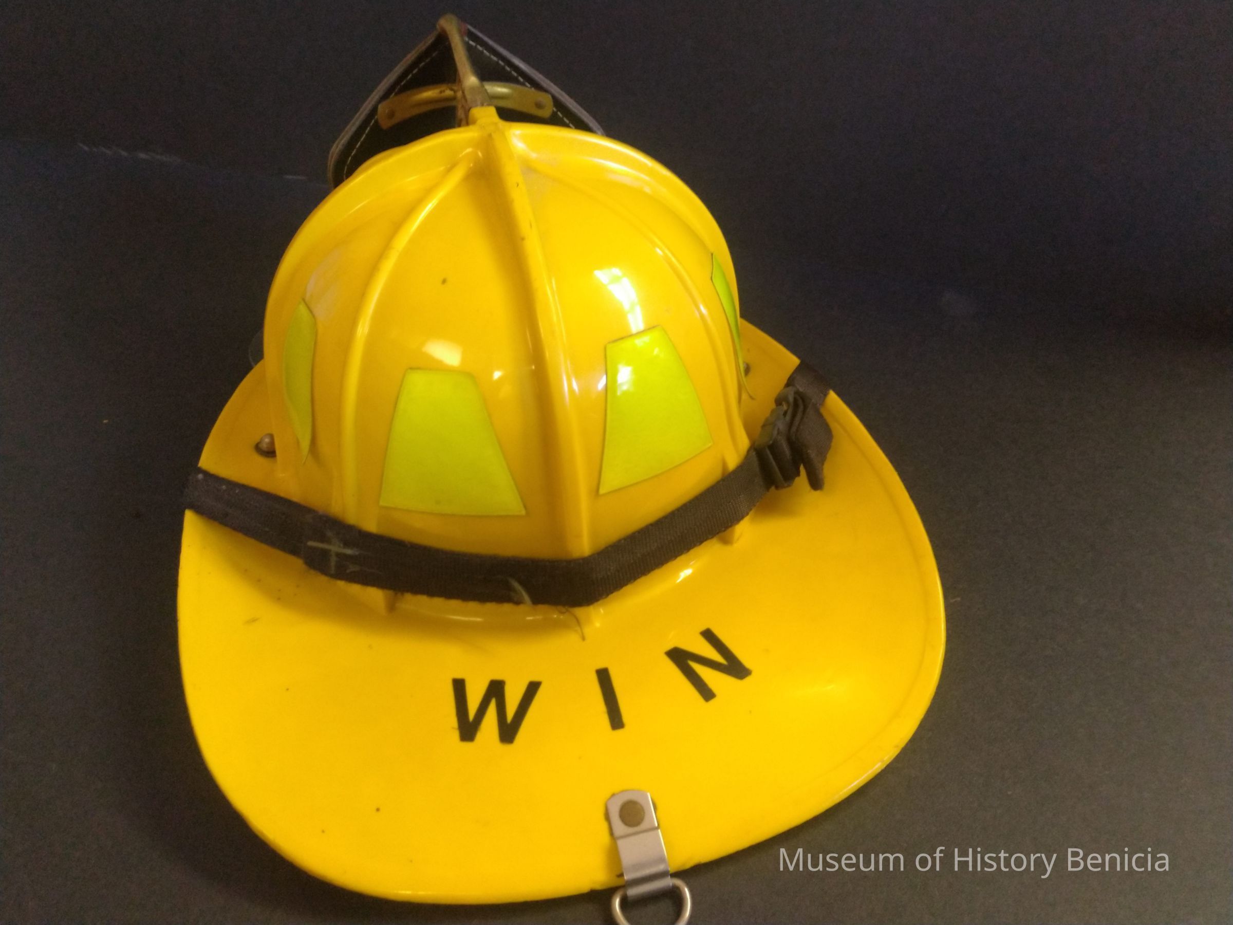 Yellow plastic Benicia Firefighter's Helmet manufactured by Cairns & Bros. Black leather shield with Benicia Fire text. Cloth suspension webbing. Reflective helmet tets. WIN in black vynol adhesive lettering on rear duckbill of the helmet.Collection