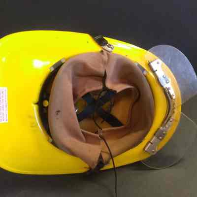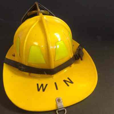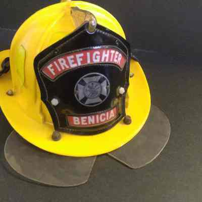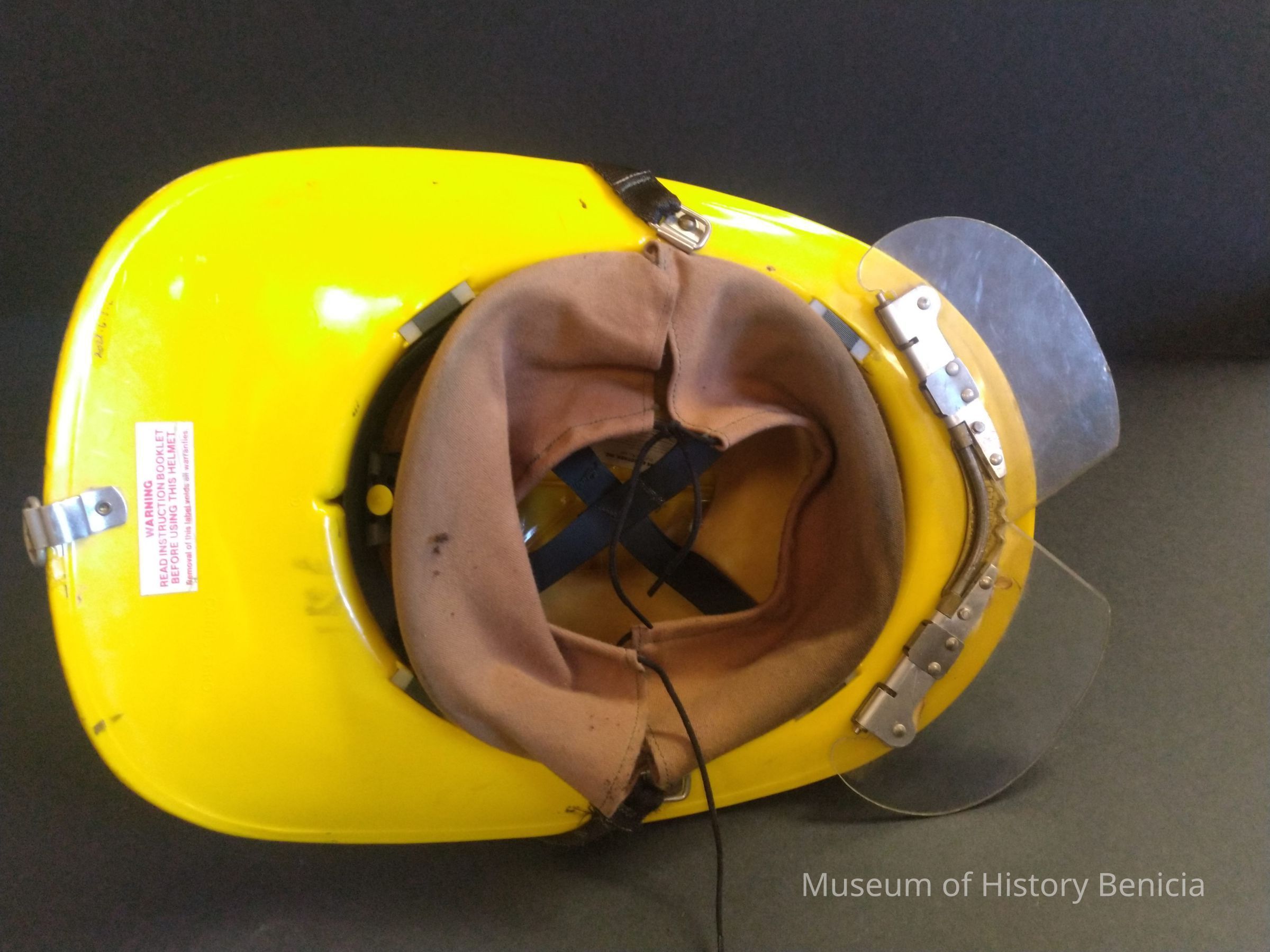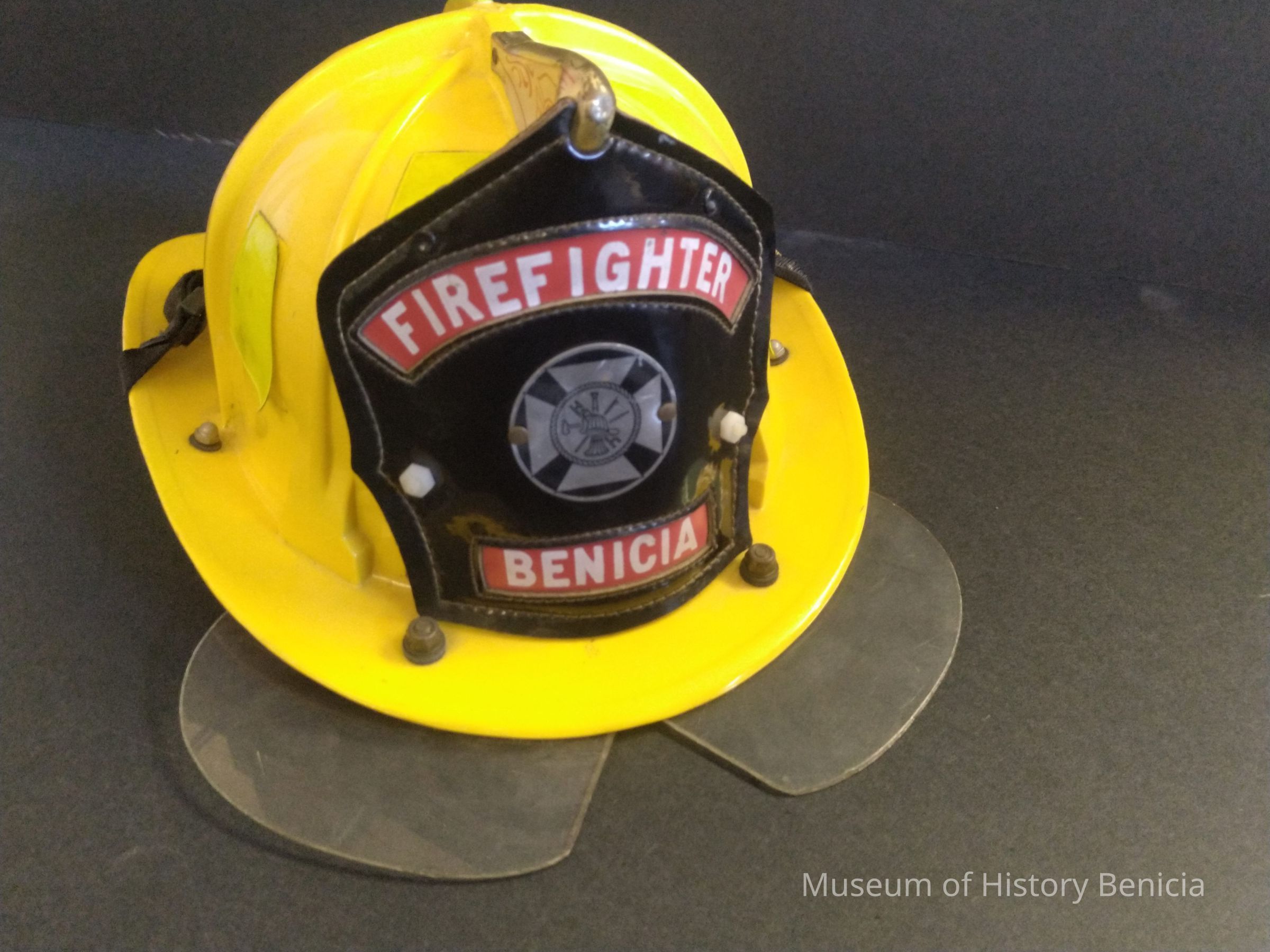 Yellow plastic Benicia Firefighter's Helmet manufactured by Cairns & Bros. Black leather shield with Benicia Fire text. Cloth suspension webbing. Reflective helmet tets. WIN in black vynol adhesive lettering on rear duckbill of the helmet.Collection