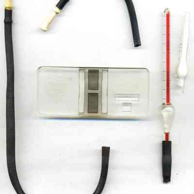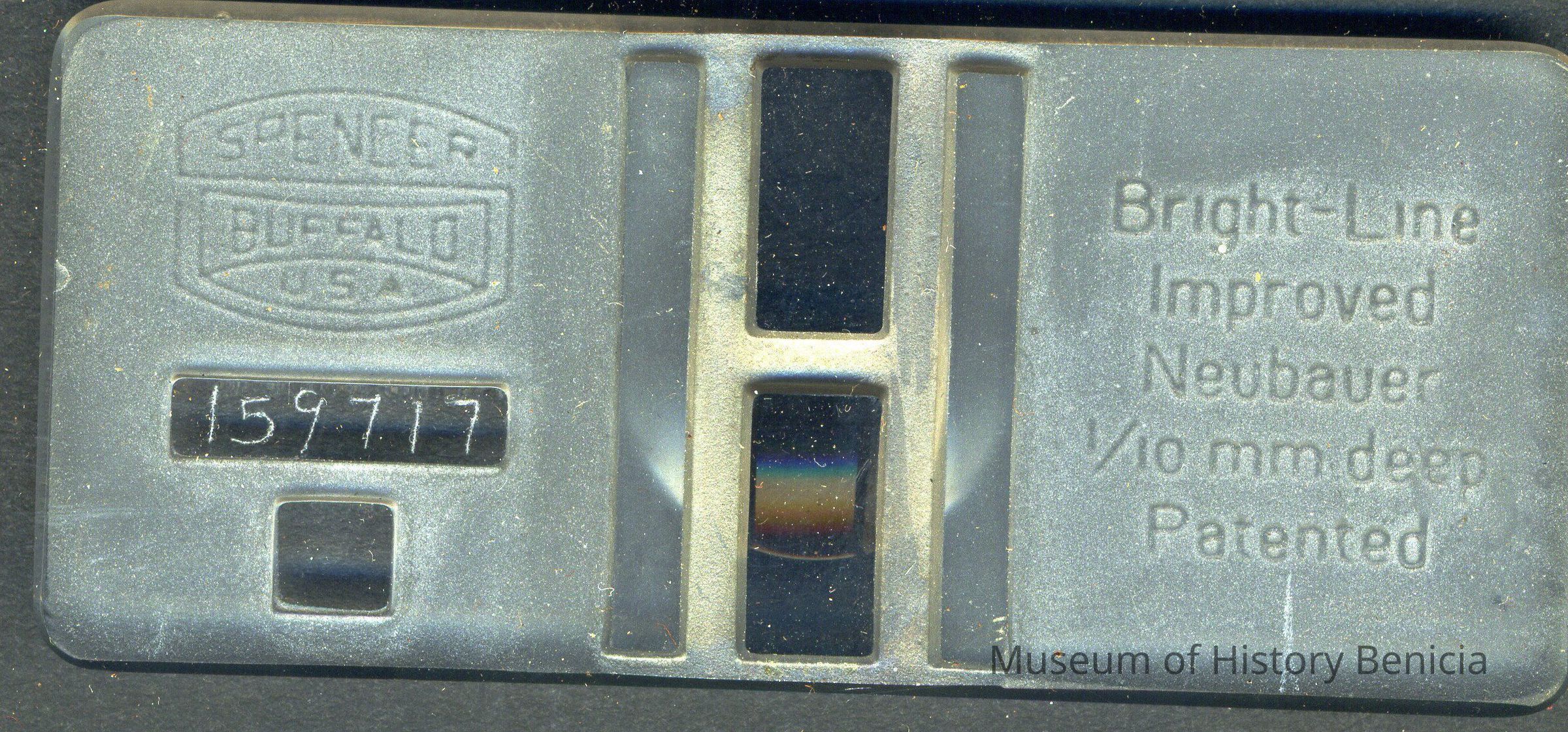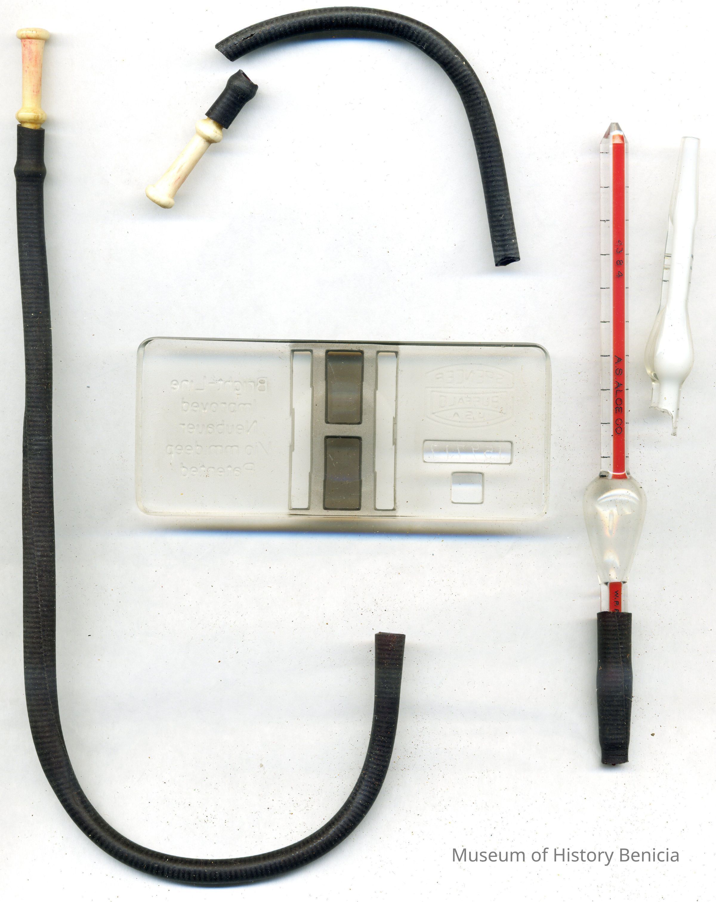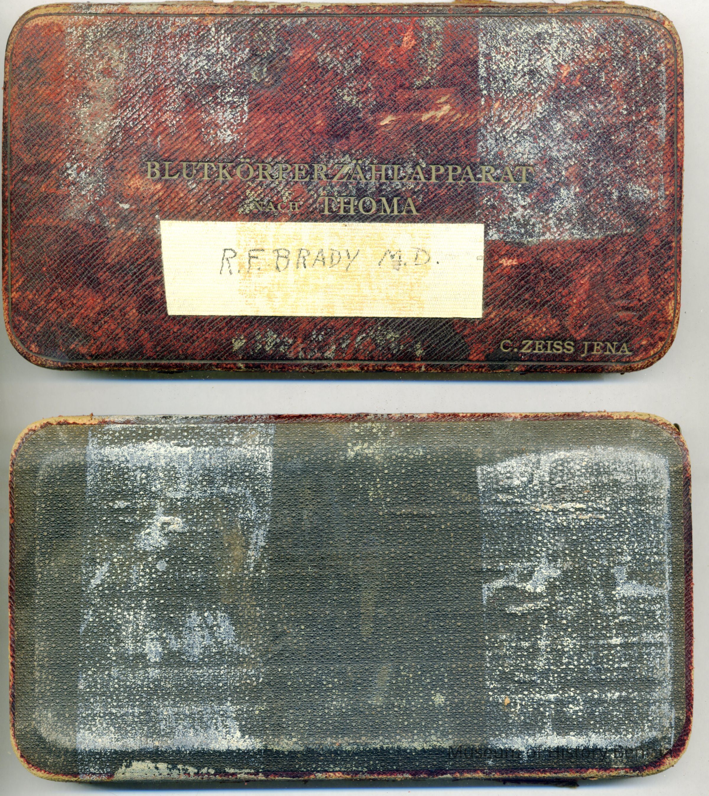 Wooden two-piece case (a,b) covered with diamond-patterned leather; inside fitted and lined with velvet; no hinges; contains (c) rubber tubing, (d,e) two glass pipettes - one broken, and (f) blood cell counter. The case is 7" x 4" x 3/4" and is marked C. Zeiss Jena in the lower left corner. (This is probably the Carl Zeiss Jena optical company. They may have made the original glass counting device for the kit. It has been replaced by one from "Spencer Buffalo USA.) It also has a name taped to the top, R.F. Brady M.D.Collection