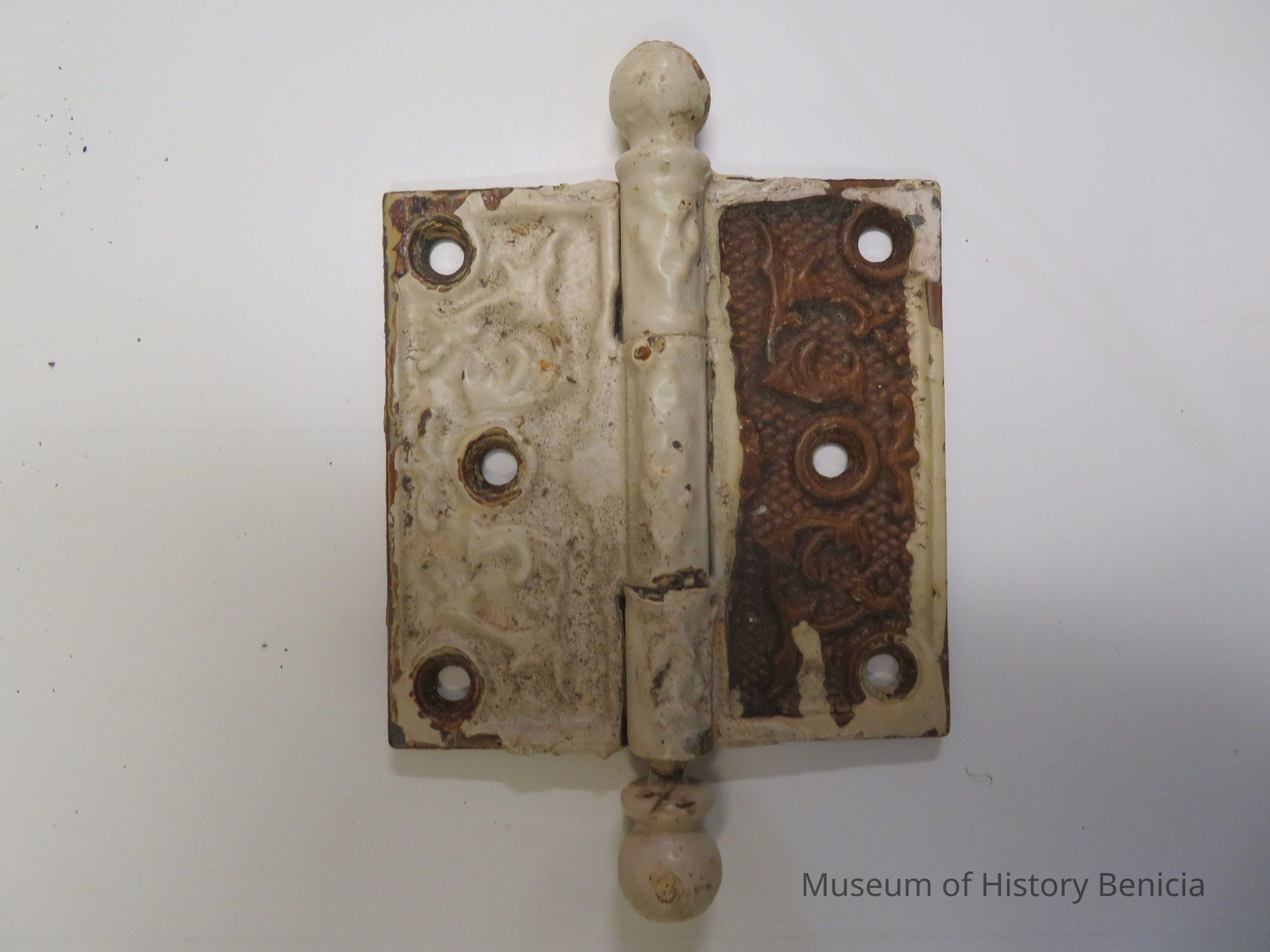 Vintage door hinge, fancy scroll on sides of hinge.