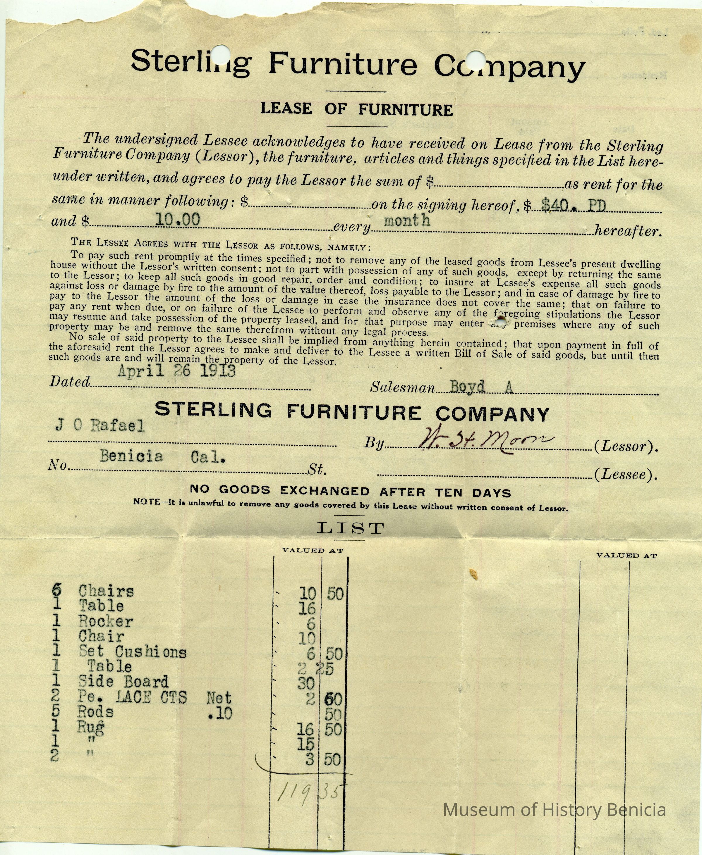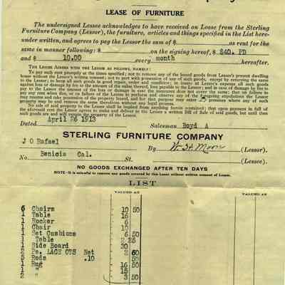 This is a receipt for the lease of furniture from the Sterling furniture store in San Francisco. It is for J.O. Rafael in the amount of $40 and $10 per month. Dated 04/26/1913.Collection