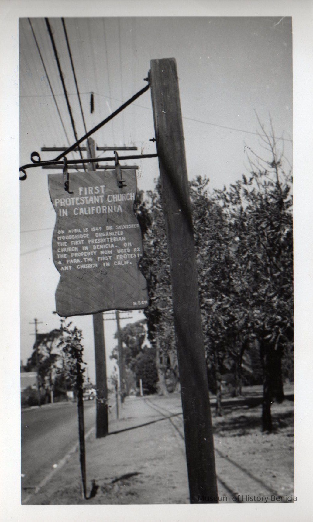 Original B/W photograph. Historical sign that reads "First Protestant Church in California."