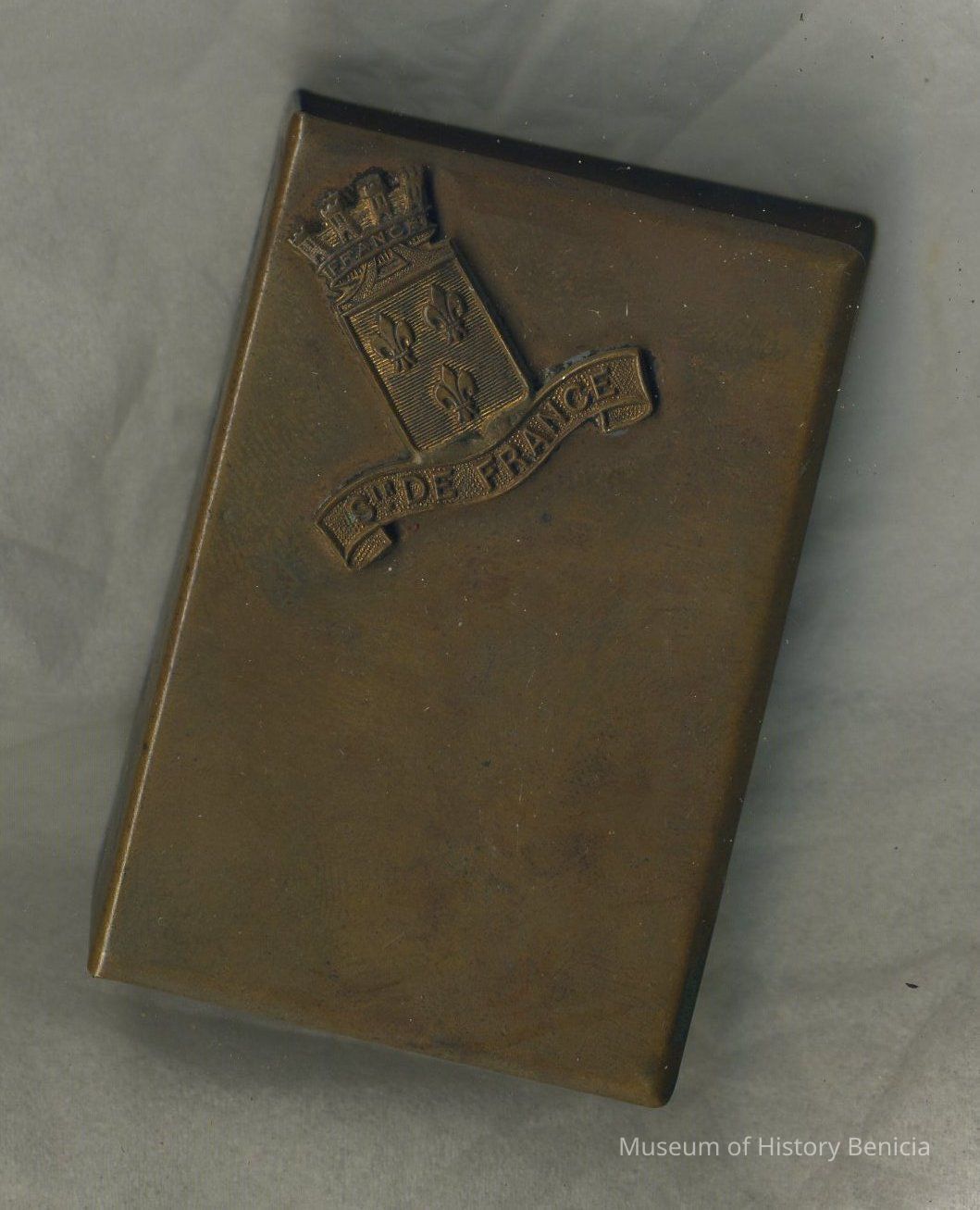 Matchbox Holder - three-sided brass holder for box of matches with crowned crest and ribbon with "S"De France" applied to one side;