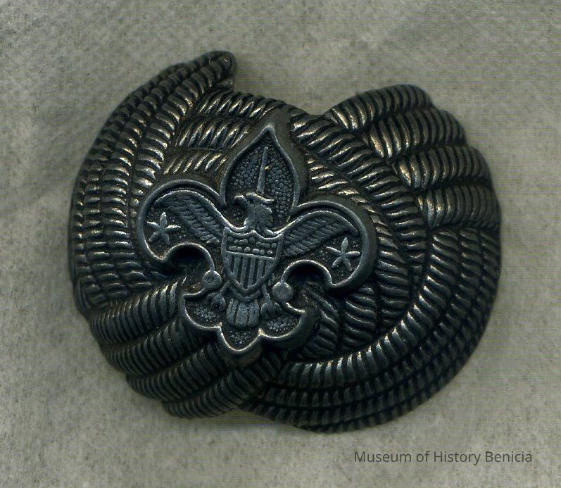 Holder for Boy Scout neckerchief/scarf; metal, pewter color, with Boy Scout Insignia and knotted rope look; 1-1/4" x 1-5/8"