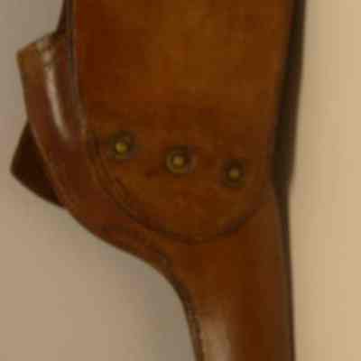 Military Holster - brown leather; loop attached with three rivets to slip on belt; flap closes over metal knob; metal ring at bottom to hold leather string to tie the holster to the soldier's thigh;