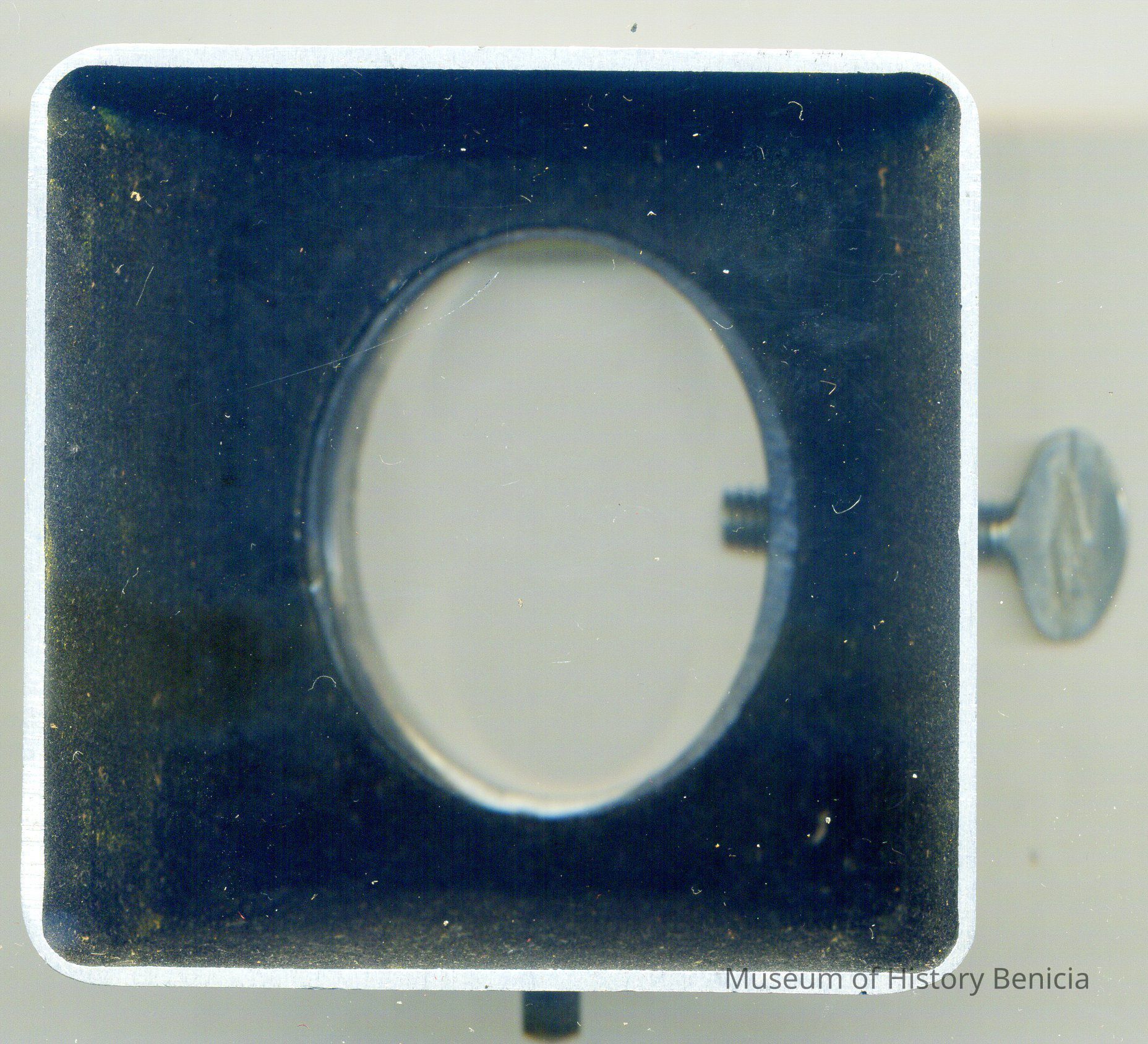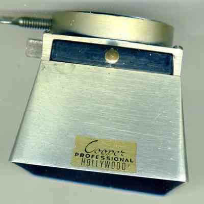 metal hood for a light or lens. The hood is 2.5 " square. There is a set screw at the base. The circular part is 1.5" diameter. It is marked "Cooper Professional Hollywood".Collection
