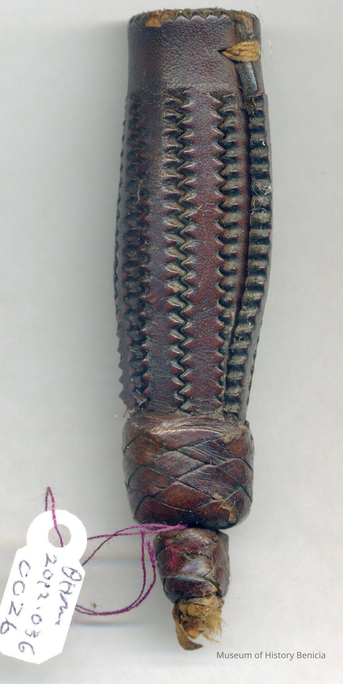 A leather piece tha looks lie a handle. It is 3.5 inches long and 3/4 inch wid. It has ribedstitches along it's length and seems to have had sometng attachedat th small end.Collection