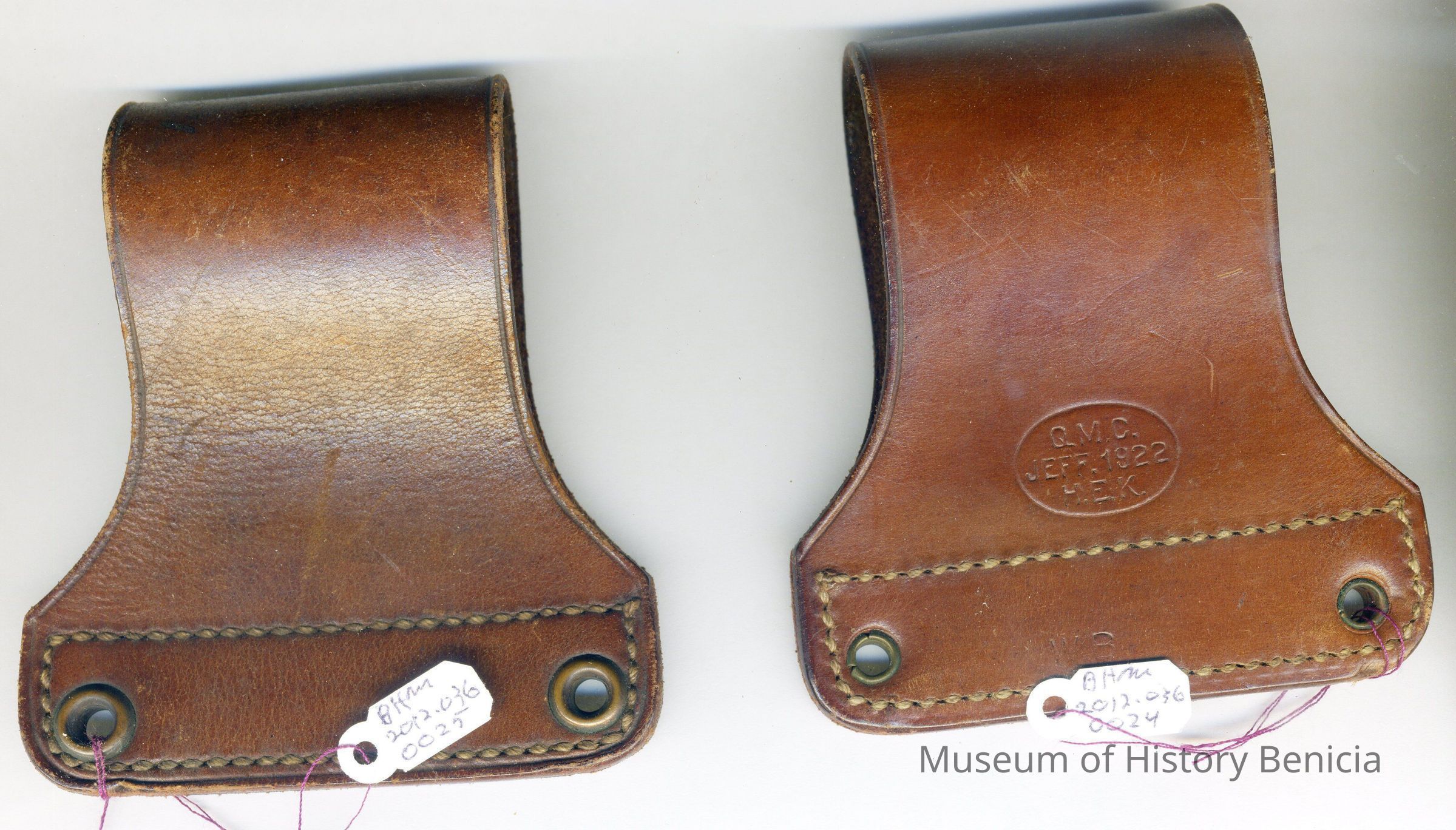 A leather piece with two rivets on one side that hold it together. It is 3.25 inches wide and 3.5 inches long. It is stamped "Q.M.C." and "Jeff 1922 M.E.K. It looks like a big belt loop.Collection