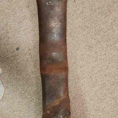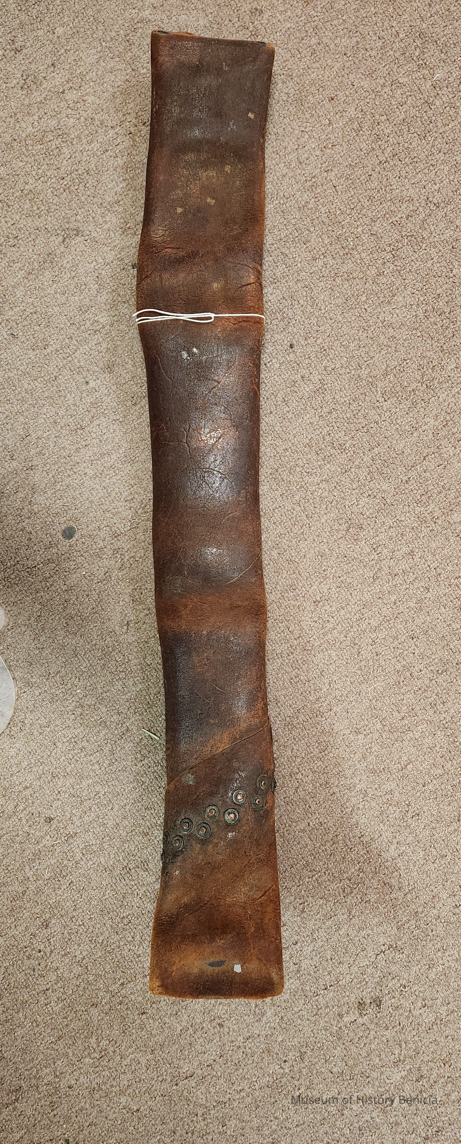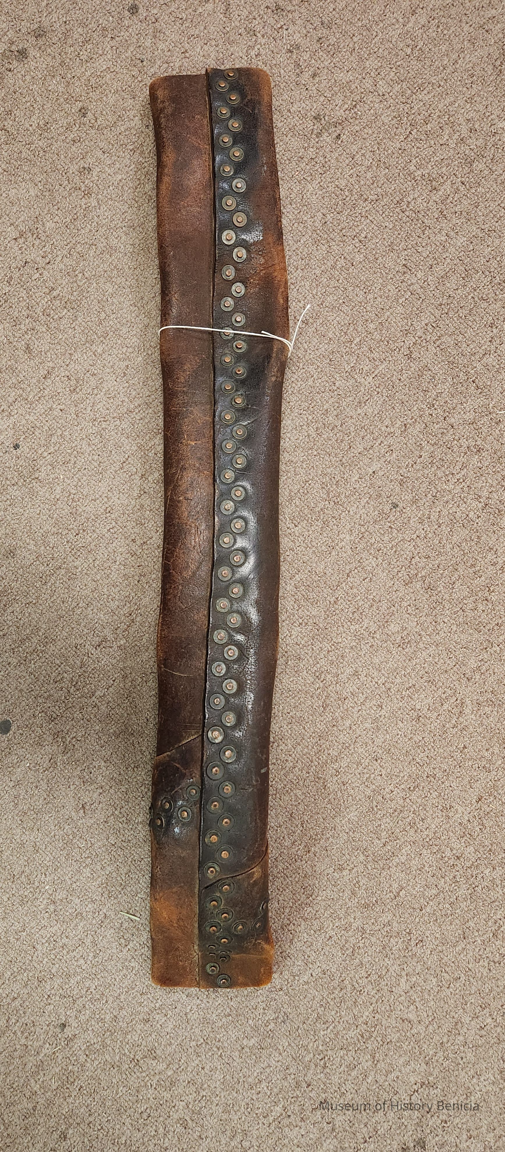 Length of riveted leather fire hose; two pieces riveted together, diagonal cut; made of leather and metal