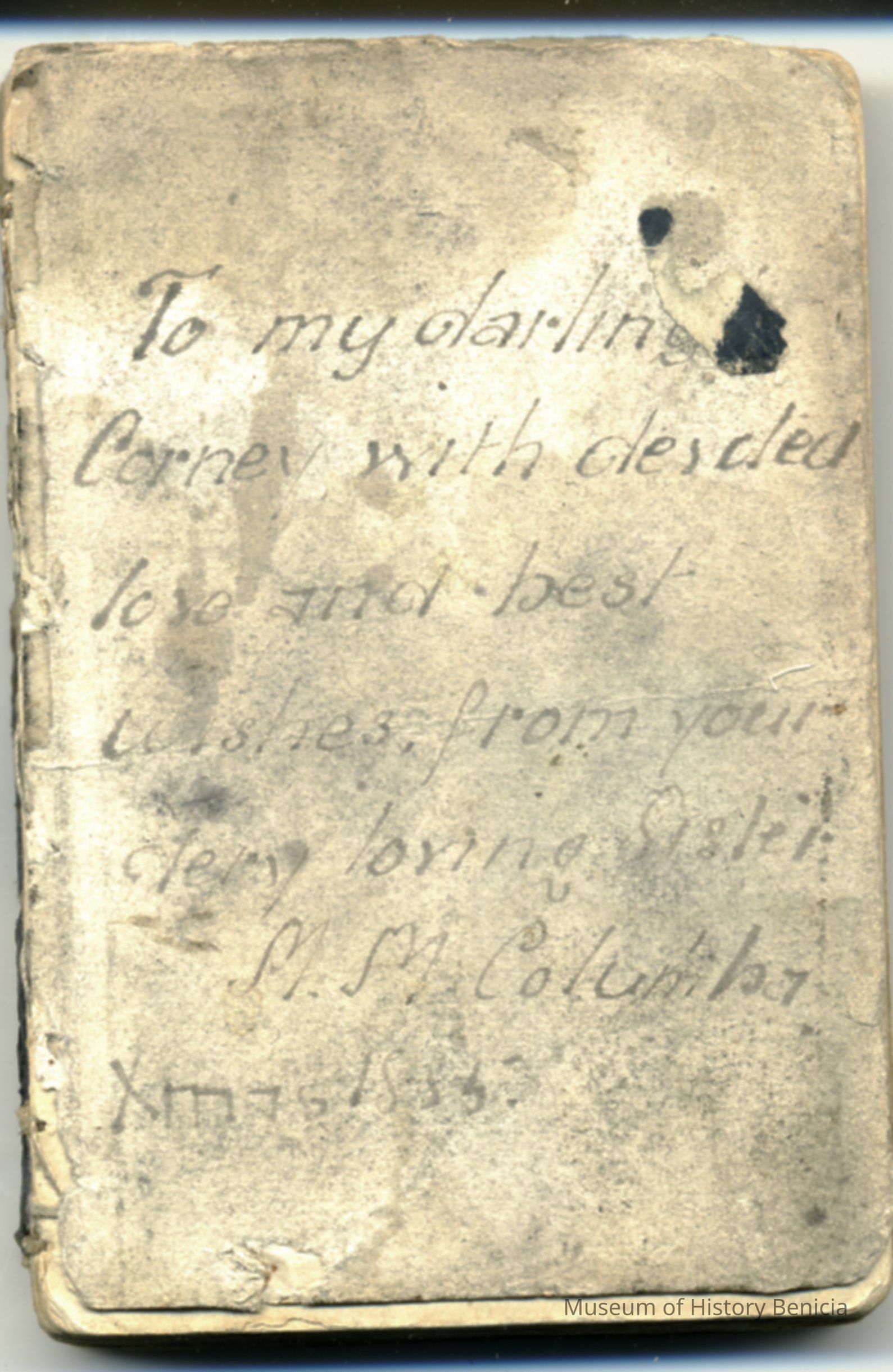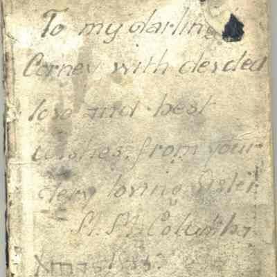 original inscription on first page (loose) "To my darling Corney with _______ love and best wishes from your loving Sister. M.M. Columbi, Xmas 1885