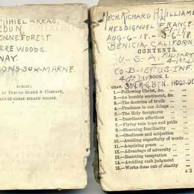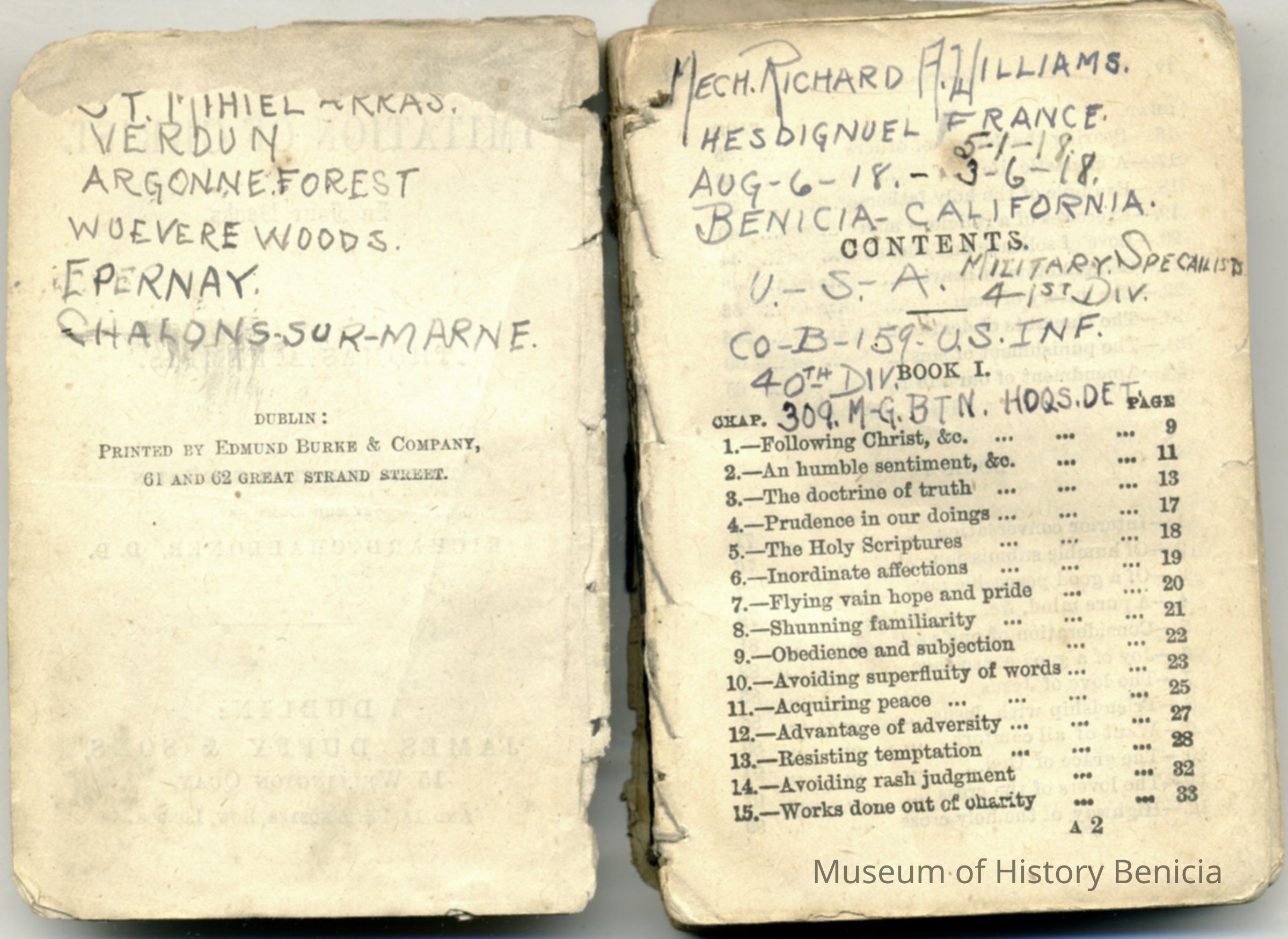 Inscription on Contents page: "Mech. Richard A. Williams, Hesdignuel France, 5-1-18, Aug-6-18 - 3-6-18; Benicia California U.S.A. Military Specialist Co B 159 U.S. Inf. 40th Div 309 M-G Tyn Hdqs Det." Written on page across from Contents page: St. Mihiel Arras, Verdun, Argonne Forest, Wuevere Woods, Epernay, Chalons-Sur-Marne