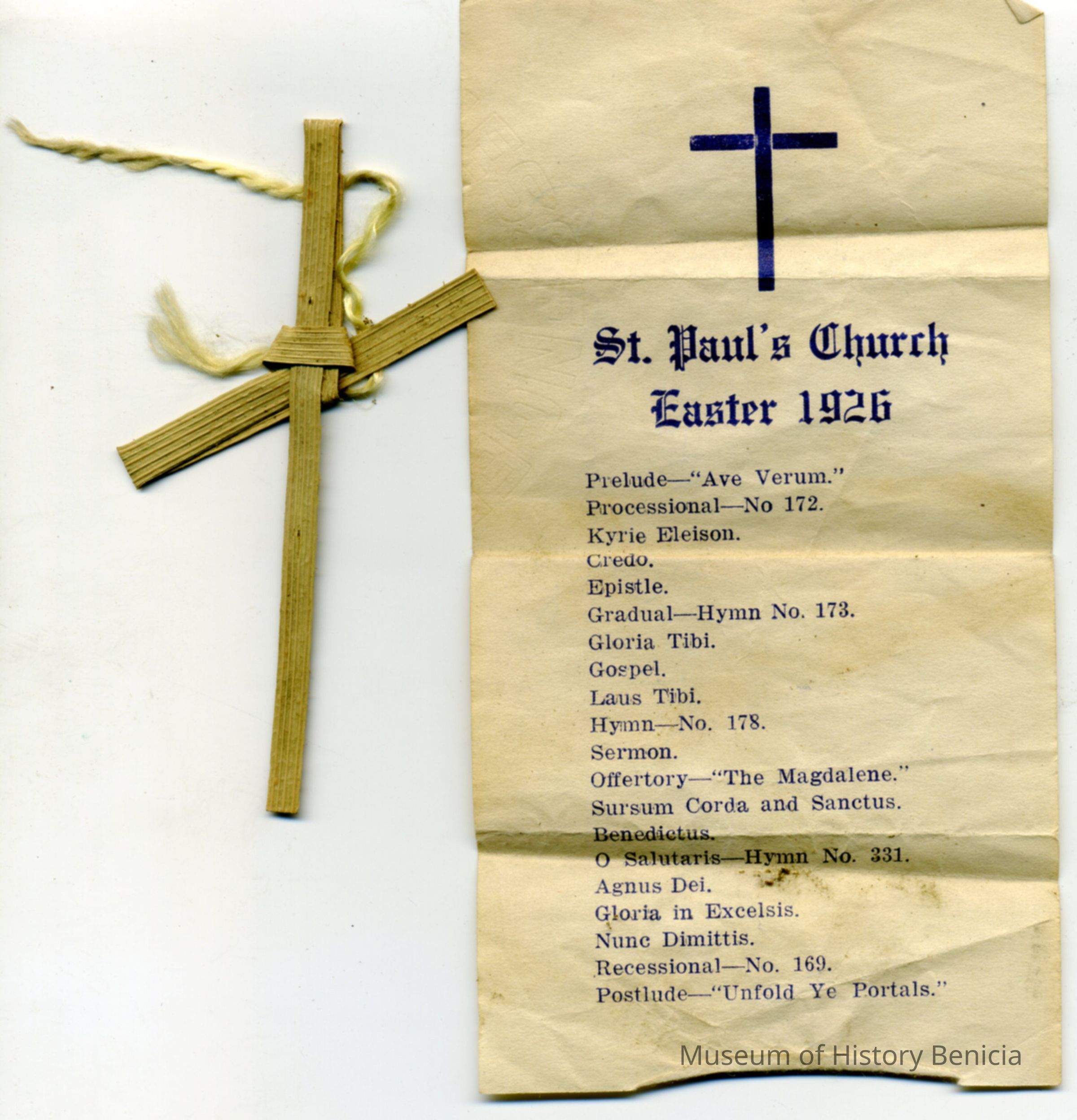 Small cross found in book is located in file cab F9 in Accession Room.