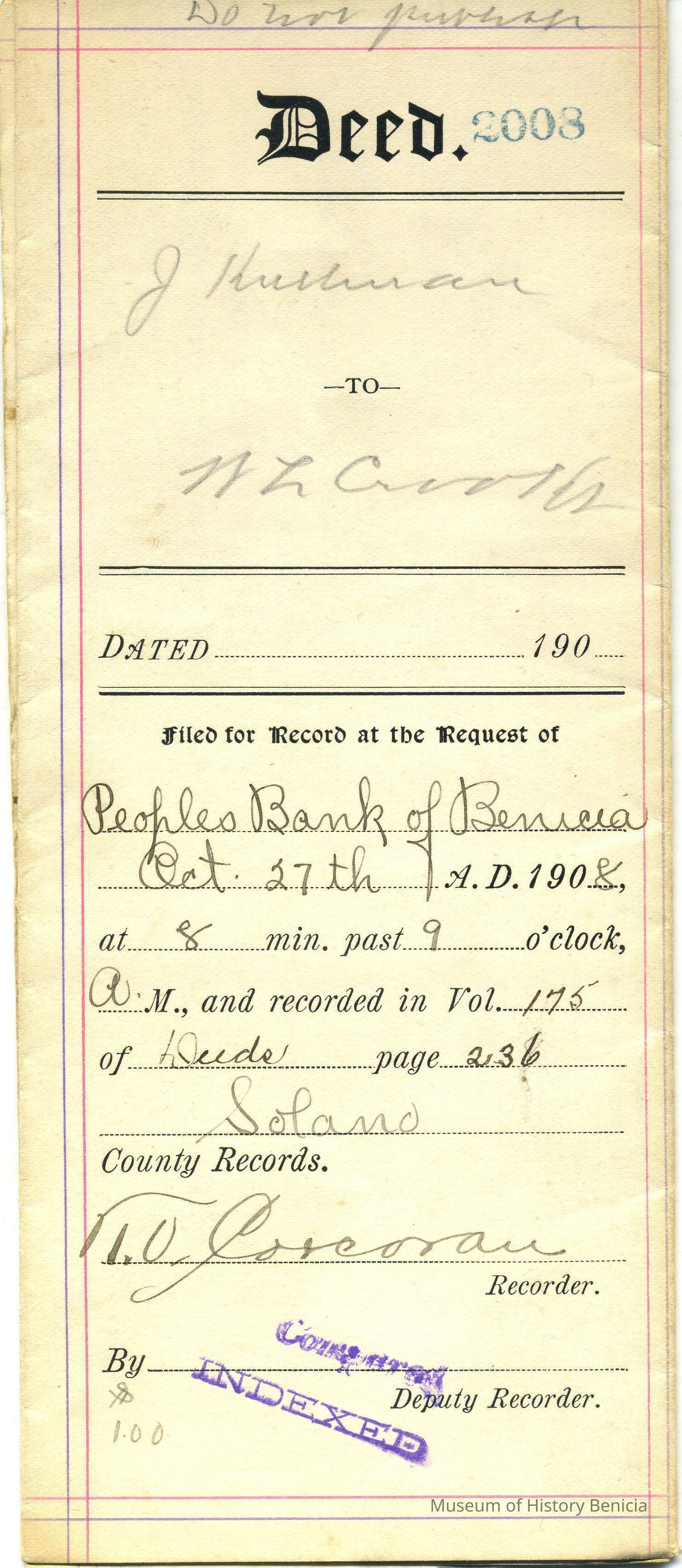 Recorded at the request of Peoples Bank of Benicia on October 27, 1908 at 9:08 am in Volume 175 of Deeds page 236 Solano County Records #2008