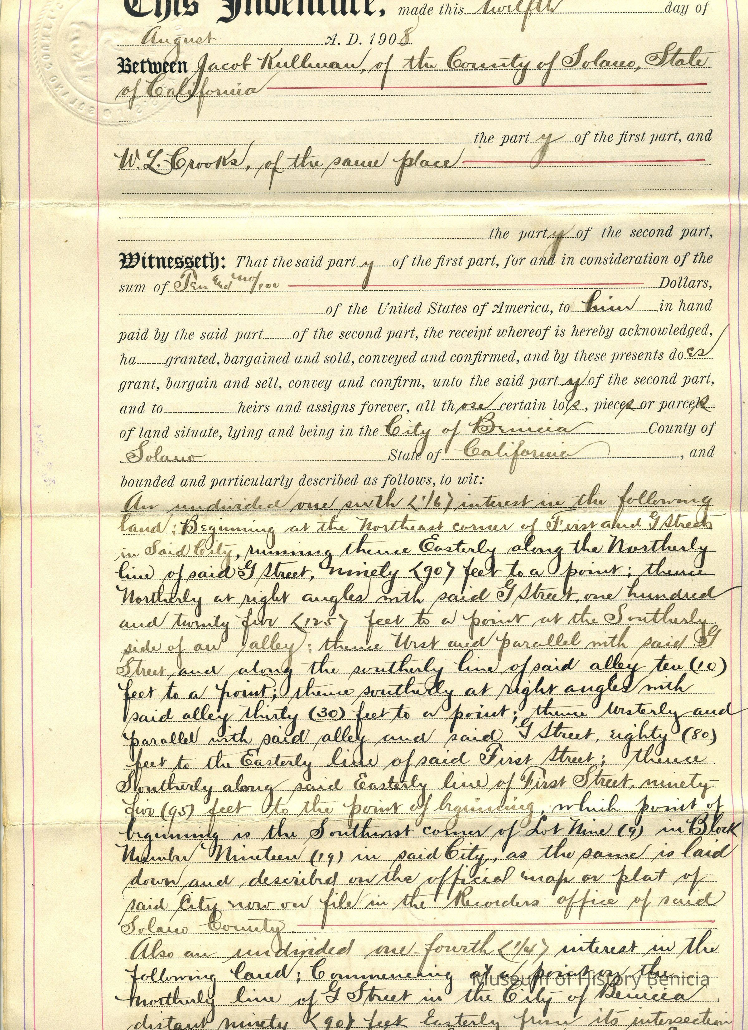 Indenture (also Deed) between Jacob Kullman of Solano County and W.L. Crooks of same place