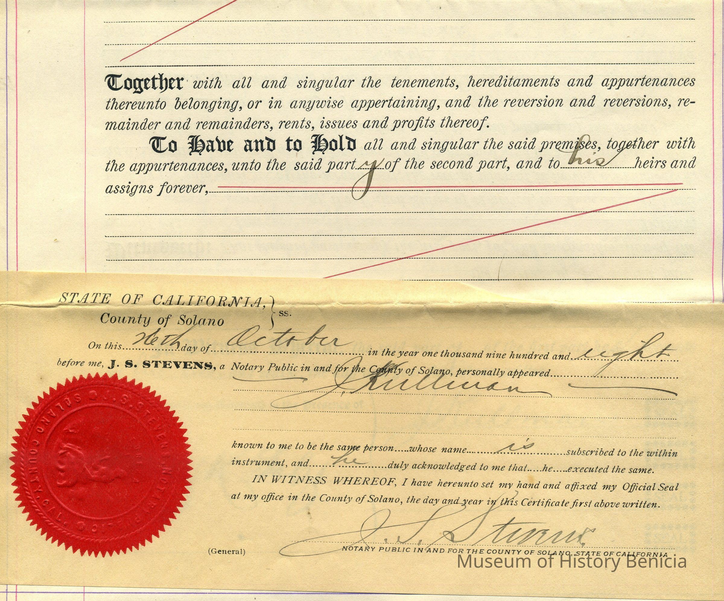 Notarized October 26, 1908 by J. S. Stevens, in Solano County impressed with red seal.