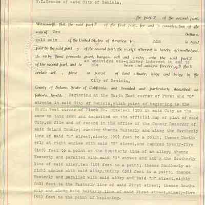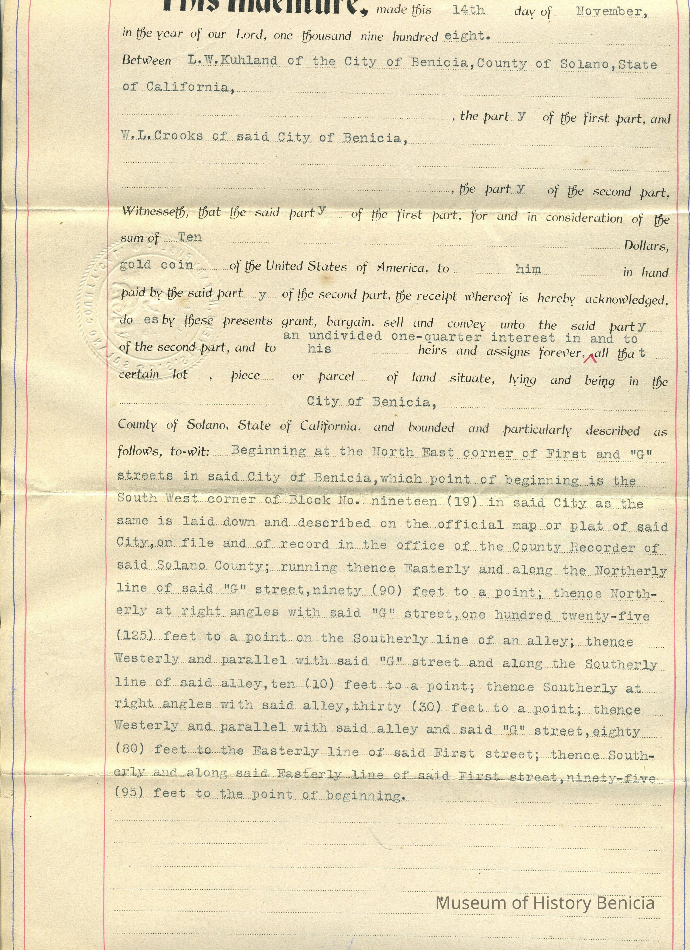 Indenture (also Deed) between Herbert Kullman of Benicia and W.L. Crooks of Benicia dated November 14, 1908