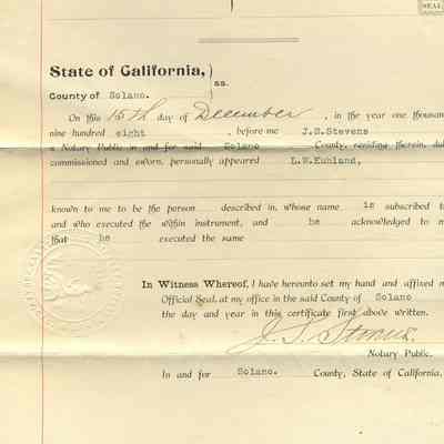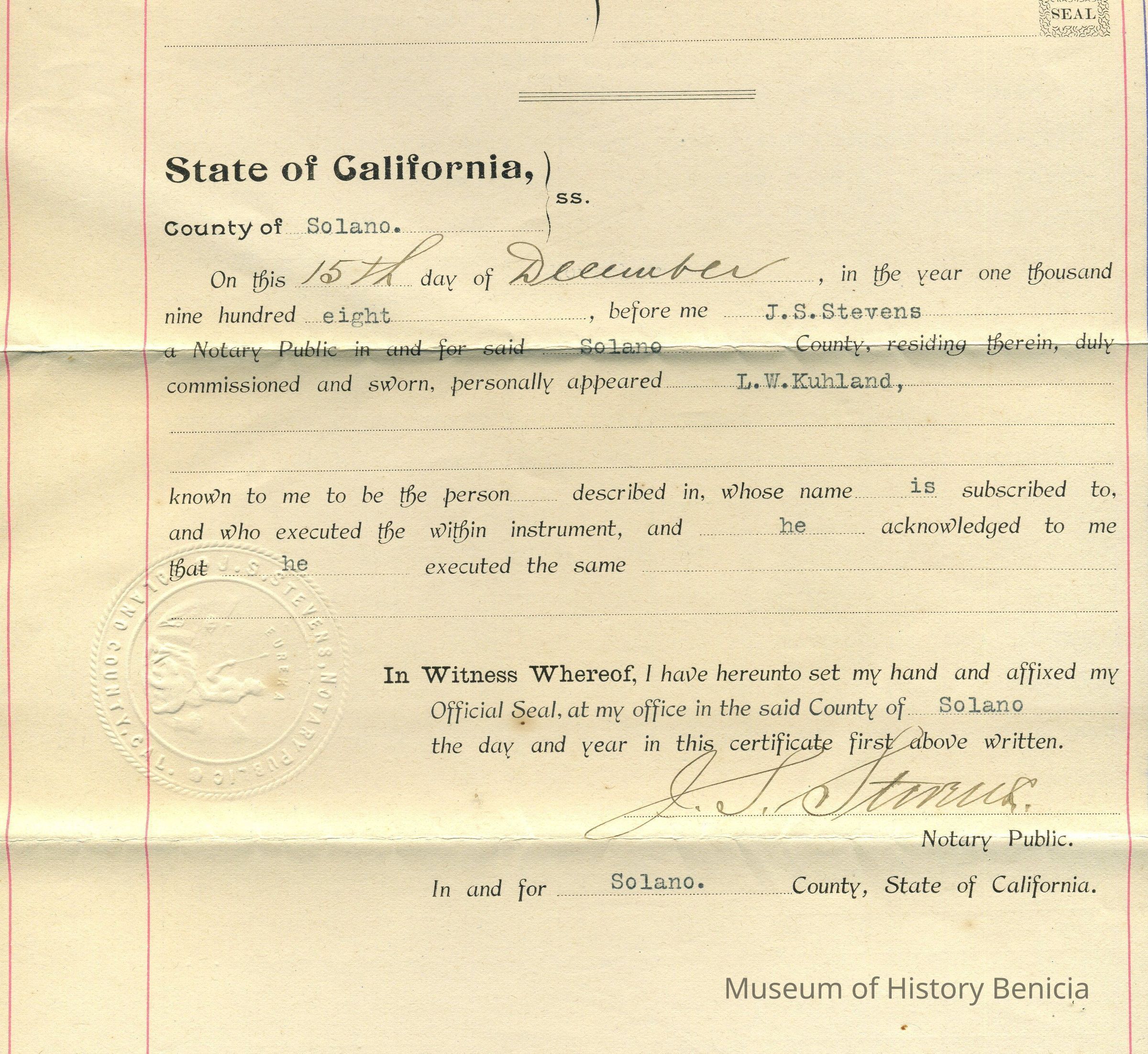 Notarized December 15, 1908 by J. S. Stevens, in Solano County impressed seal only.