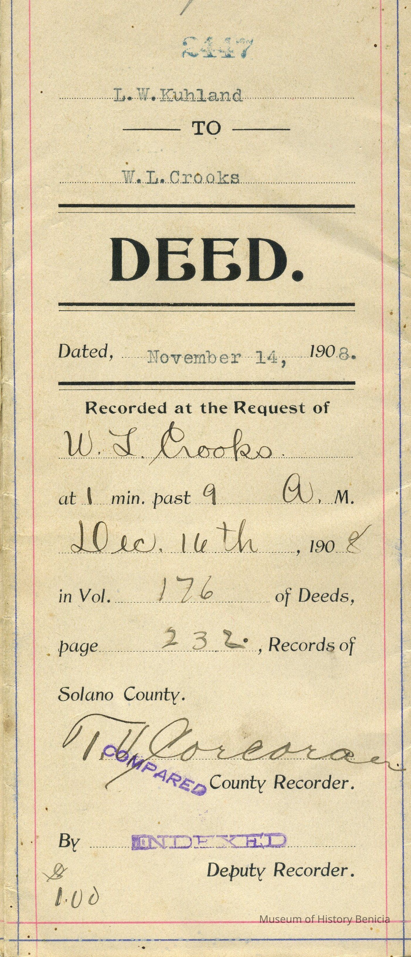 Recorded December 16, 1908 at 9:01 am in Volume 176 of Deeds page 232 Solano County Records #2447