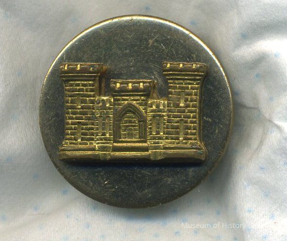Collar insignia - round brass button - engineers' symbol (castle-like building); screw-on back; 1" diameter