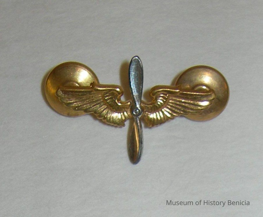 Army Air Corps Cadet Lapel Insignia, brass, wings/propeller, 2 push on attachments on back; (propeller is silver colored)