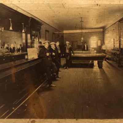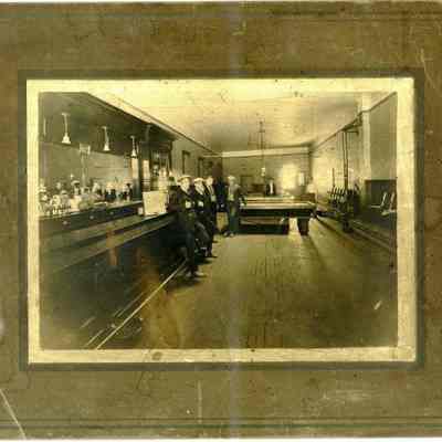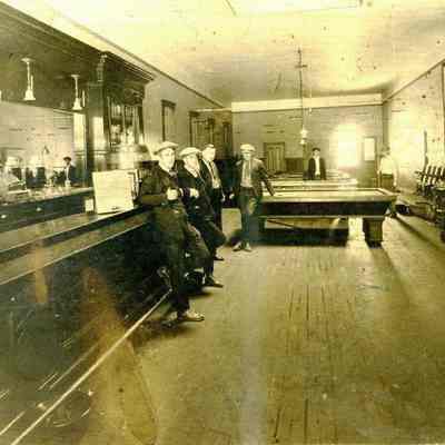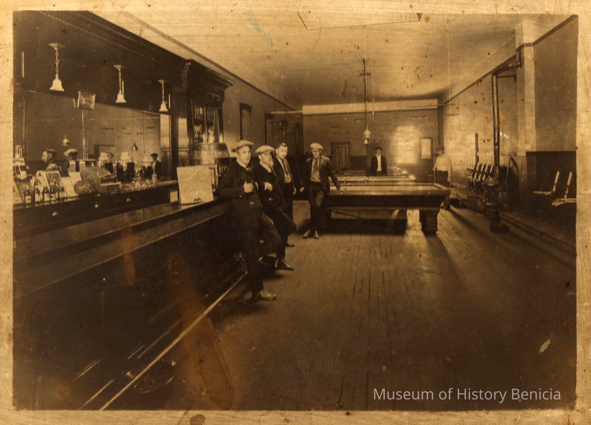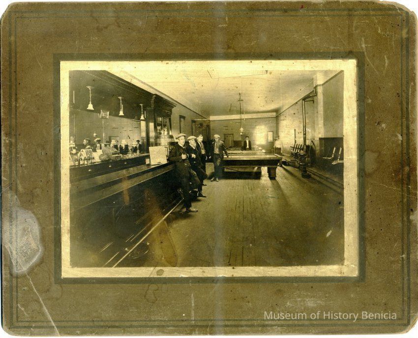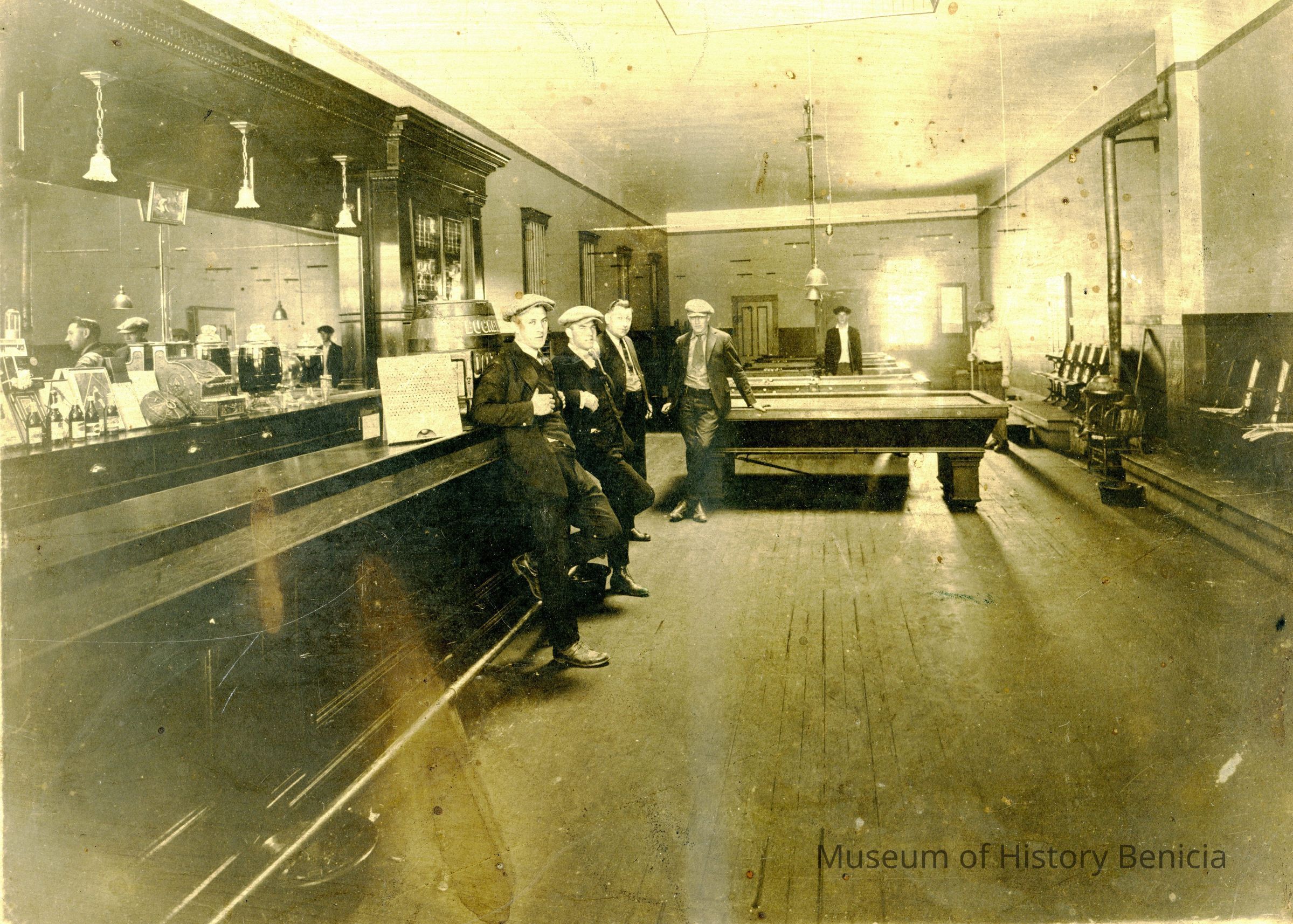 Interior photo of unidentified Benicia bar. People in photo unidentified. B/W photo. There is a "punch board" on the bar. This was an early gambling device.Collection